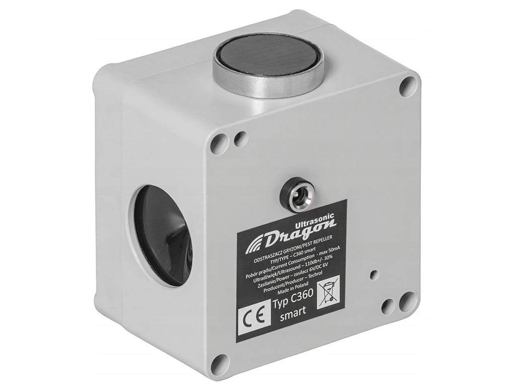 Moderný a výkonný ultrazvukový plašič DRAGON ULTRASONIC C360 SMART predstavuje efektívnu ochranu proti kunám a hlodavcom v interiéri aj exteriéri. Je vybavený vodotesným krytom, tromi membránovými reproduktormi a má dosah až 1500 m². Ultrazvukový signál s automatickou zmenou frekvencie pôsobí odpudzujúcim účinkom a zabraňuje tomu, aby si škodce na zvuk zvykli. Montáž je vďaka silnému magnetickému držiaku veľmi jednoduchá a napájanie zabezpečuje 6V adaptér, ktorý je súčasťou balenia. Rozmery zariadenia sú kompaktné – 85 x 85 x 55 mm.