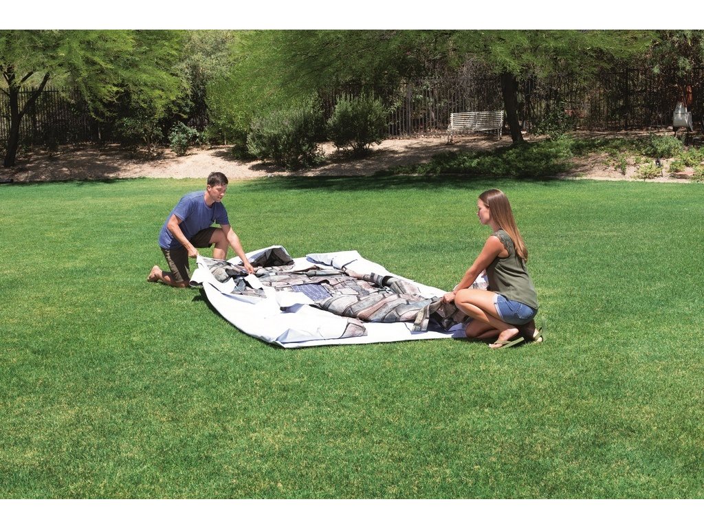 - Na vybrané miesto rozložte podložku pod bazén a na ňu rozprestrite bazén rozložením jeho stien a dna. Pre jednoduchšiu manipuláciu s fóliou nechajte rozložený bazén 2 hodiny na slnku.