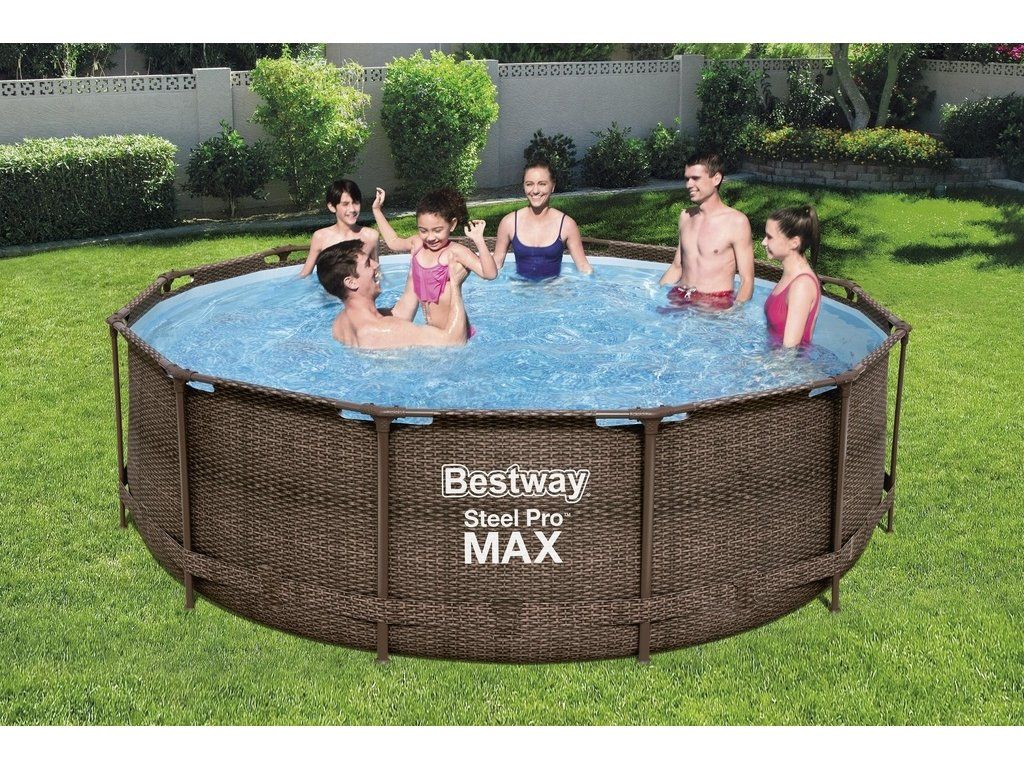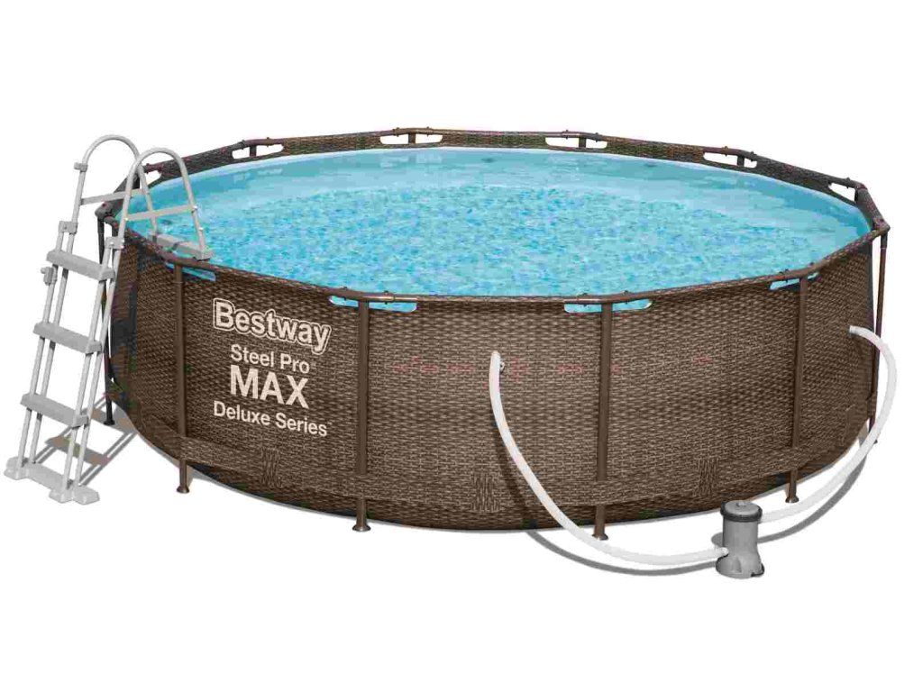 Nadzemný bazén Steel Pro Max™ Deluxe v prevedení imitácie hnedý ratan s konštrukciou s priemerom 3,66 metrov a celkovou hĺbkou 1,00 meter je perfektným spoločníkom pre všetkých, ktorí túžia po osviežujúcich domácich letných radovánkach. Dodávame v sade s kartušovou filtráciou a bezpečnostnými schodíkmi.
