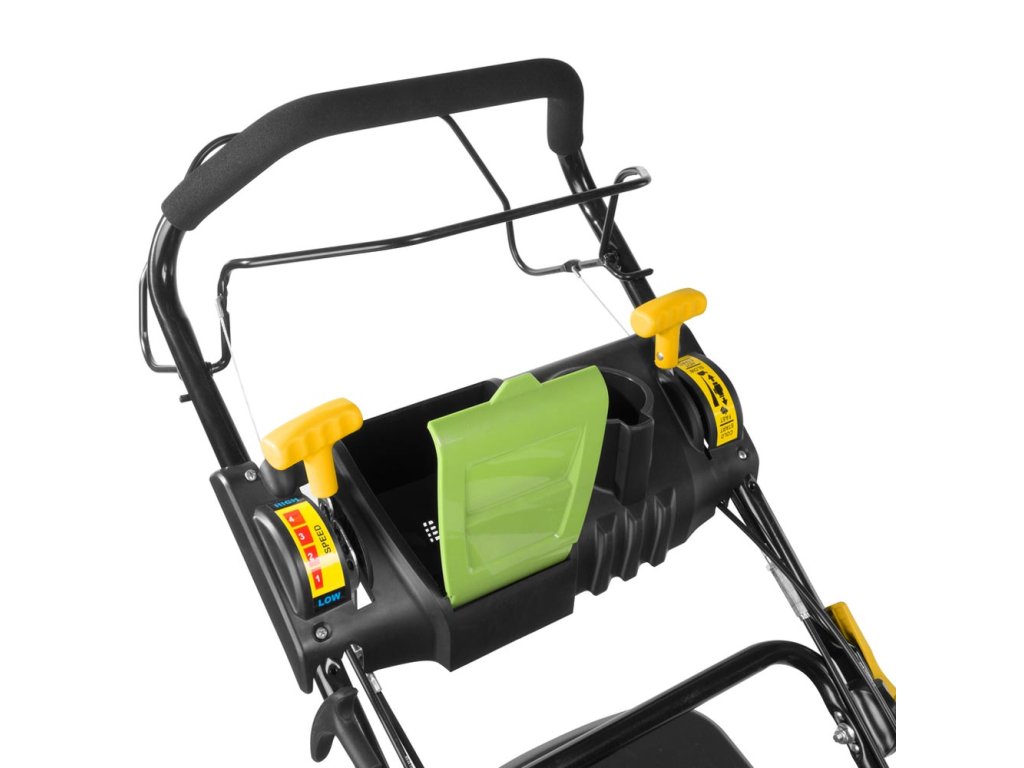 Kolesá sú uložené na guľôčkových ložiskách, čo predlžuje ich životnosť a zlepšuje otáčanie kolies. Zberný kôš s objemom 65 l je vybavený ukazovateľom zaplnenia, ktorý vás upozorní, že treba kôš vysypať. Tiež zabraňuje prestupu prachu a pojme dostatok trávy. Kosačku oceníte aj vďaka nízkym nárokom na uskladnenie, ktoré minimalizuje sklopné držadlo kosačky. Držadlo nielen, že šetrí priestor, ale aj vďaka mäkčenému poťahu tlmí vibrácie a zvyšuje pohodlie obsluhy.