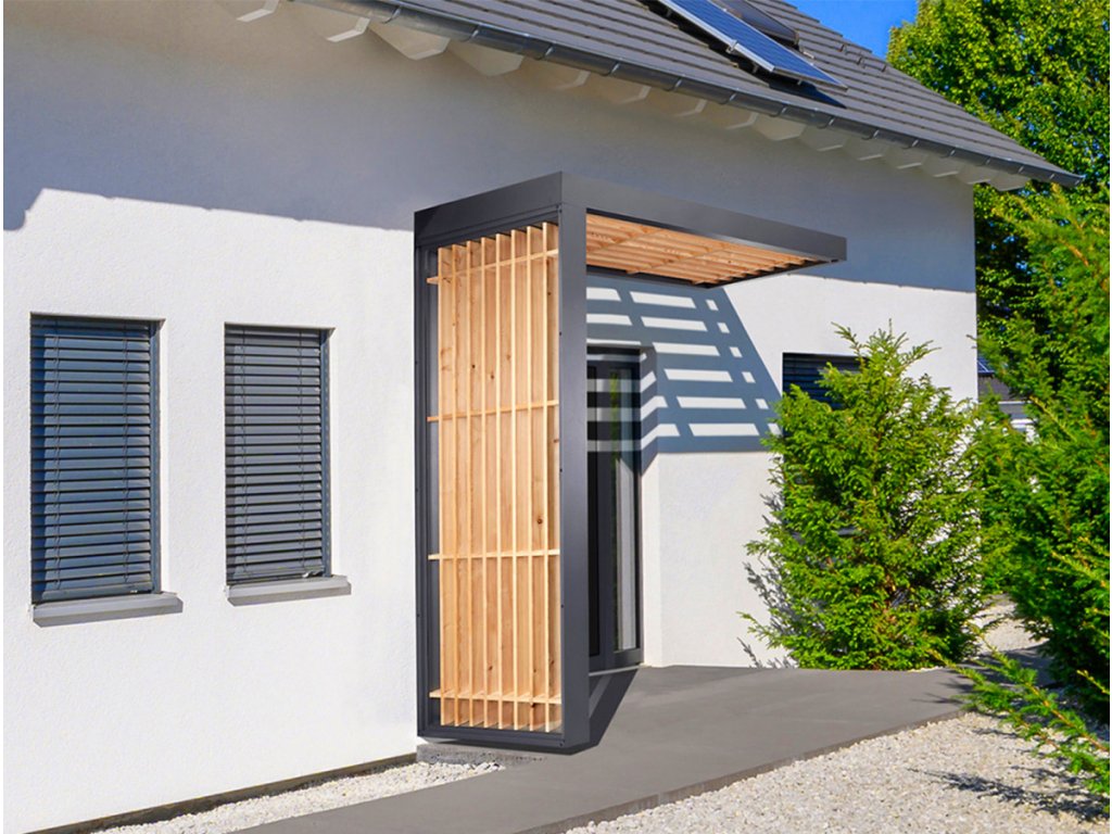 Dodatočným prvkom zastrešenia je bočná stena GUTTAVORDACH BS Timber-Line pre vchodovú striešku typu GUTTAVORDACH BS Timber-Line. Je vyrobená z práškovo lakovaného hliníka. Hliníková konštrukcia perfektne odoláva vplyvom počasia, aj po rokoch je pevná a stabilná. V zime mrazom nekrehne a ani na silnom letnom slnku nedochádza k zmenám farby. Stena je zasklená čírym akrylovým sklom.