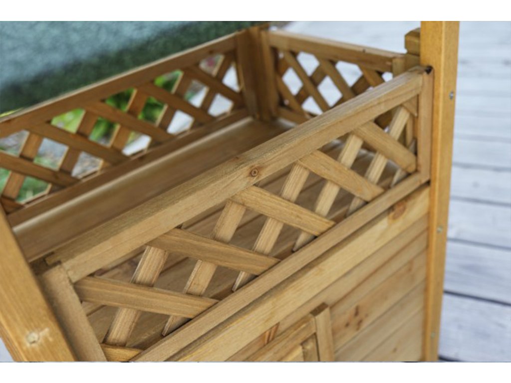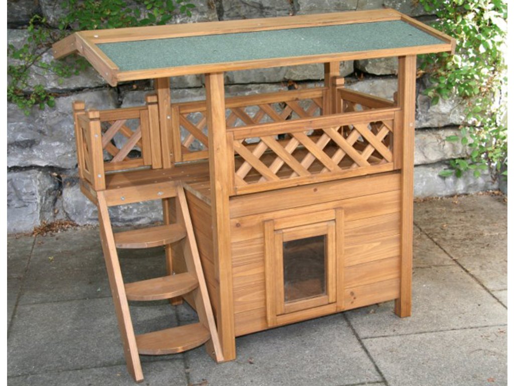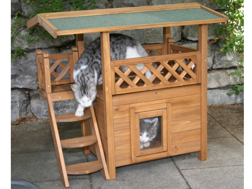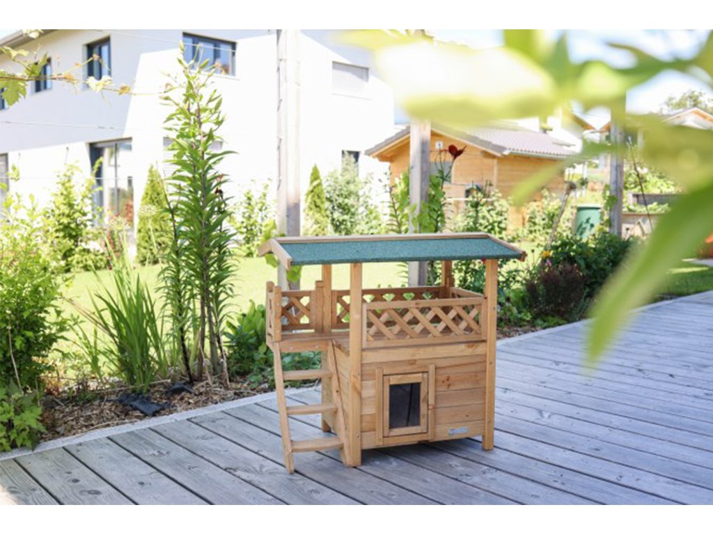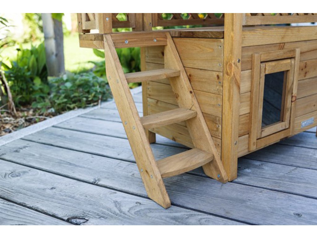 Domček pre mačky umiestnený na prízemí zaisťuje bezpečné a pokojné prostredie pre odpočinok maznáčikov. Nad domčekom je umiestnená krytá terasa, na ktorú majú mačky ľahký prístup cez drevené schodíky. Dvierka sú opatrené priehľadnými odklopnými dvierkami, ktoré mačku chránia vo vnútri búdy proti vetru a chladu.