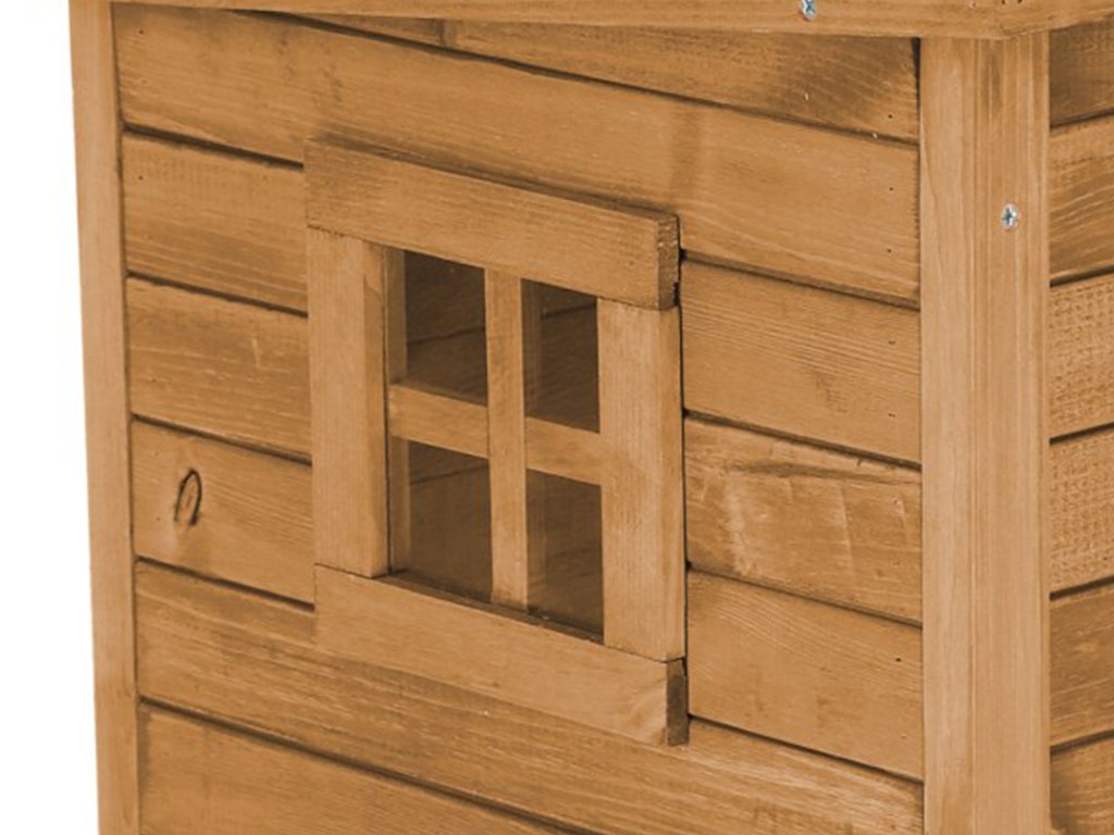 Búda pre mačky vyrobená z dreva má hmotnosť cca 7 kg. Strecha domčeka je pokrytá ochranným nepremokavým materiálom. Napriek tomu odporúčame búdu umiestniť pod prístrešok, aby bola chránená pred dažďom, snehom a extrémnym slnečným žiarením. Drevený domček je povrchovo ošetrený základným ochranným náterom. Pre dlhšiu životnosť treba, ako pri každom dreve, ochranný náter obnovovať.