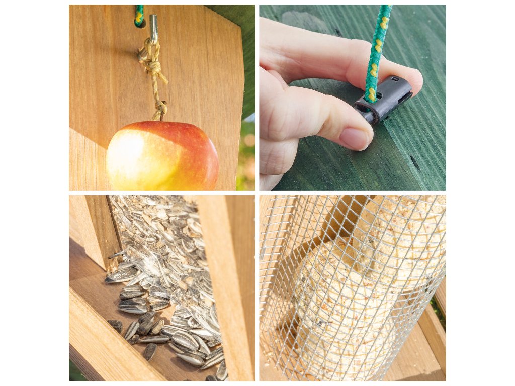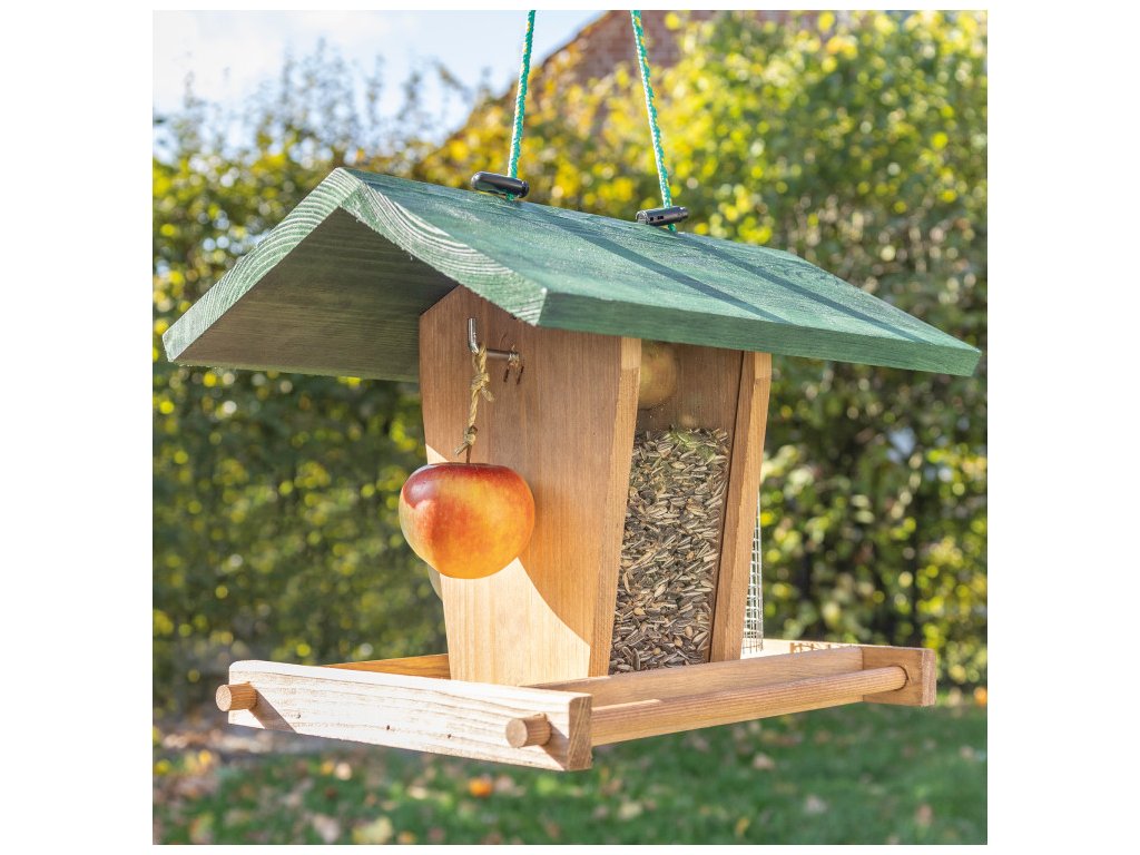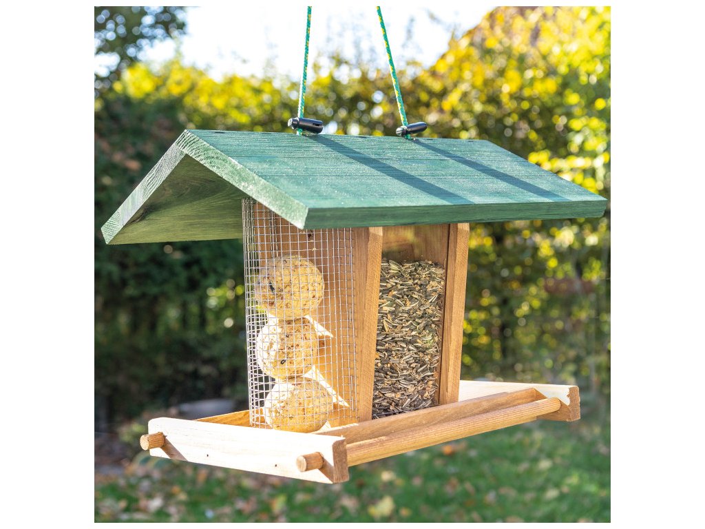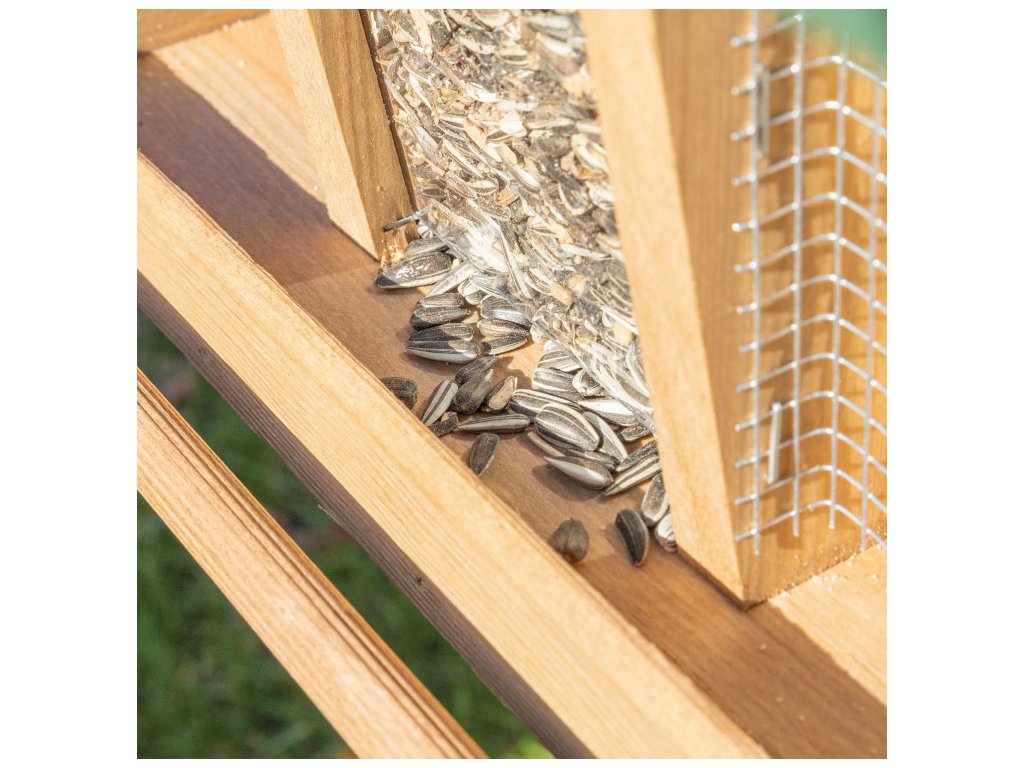 Kŕmidlo je možné rýchlo a jednoducho naplniť väčším množstvom krmiva – nie je teda potrebné ho neustále dopĺňať. Dopĺňanie je veľmi jednoduché – stačí zložiť strechu domčeka a pridať nové dobroty, ako sú lojové gule, orechy či podstielka. Vďaka pevným plexisklám ľahko uvidíte, kedy je potrebné kŕmidlo znovu doplniť. Krmivo je zároveň ideálne chránené pred vlhkosťou. Malí návštevníci, ako vrabce, červienky a iné vtáčiky, sa môžu usadiť na dvoch bočných bidlách a pohodlne zobkať zrno zo sila.