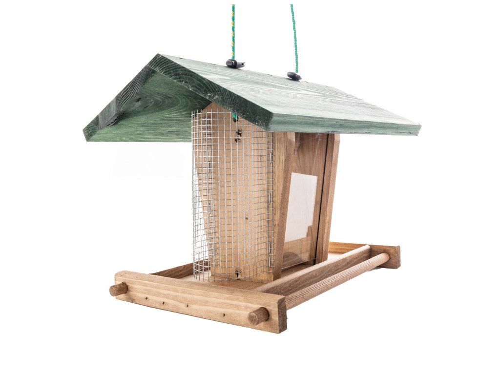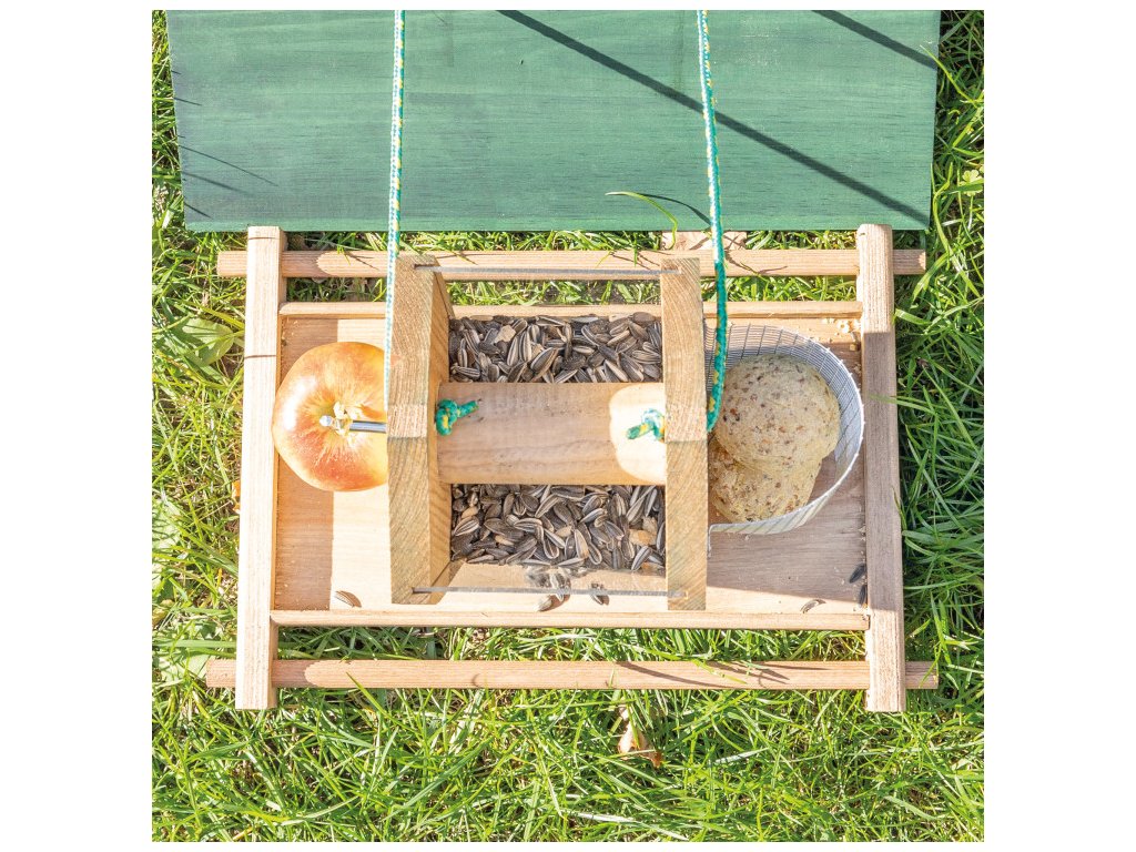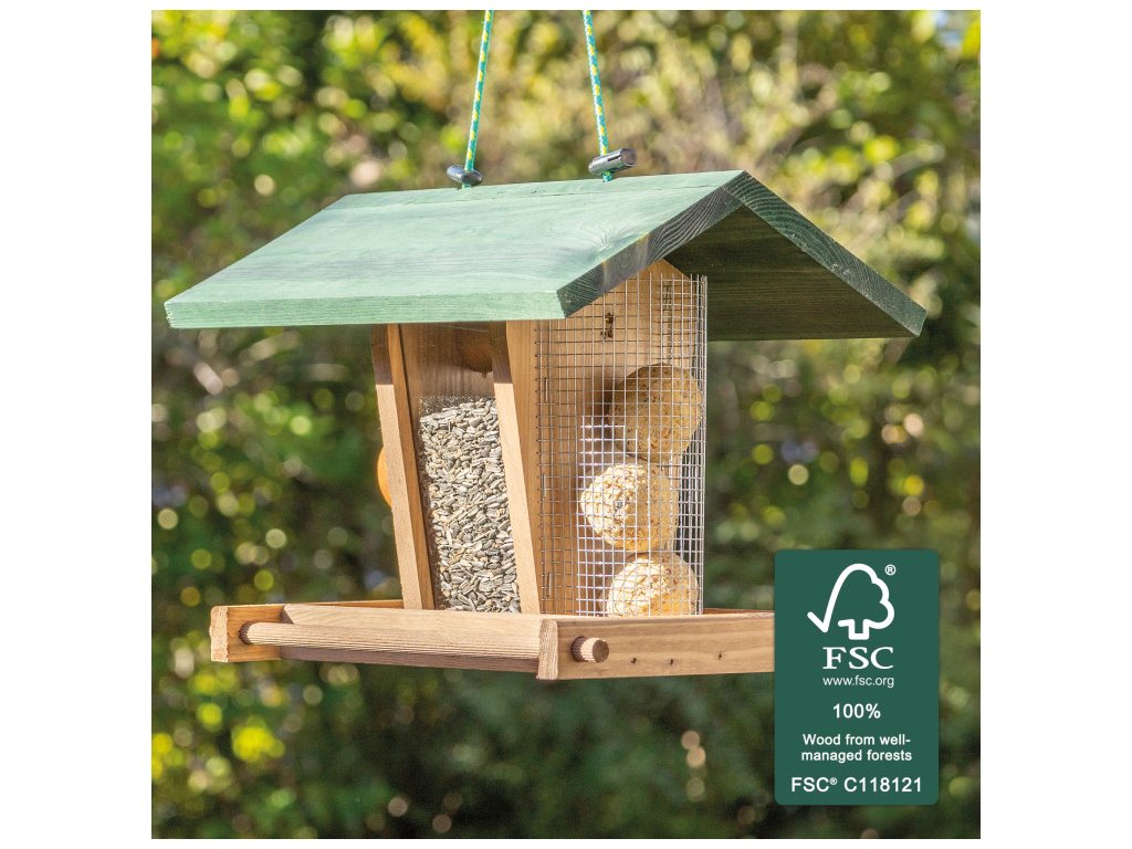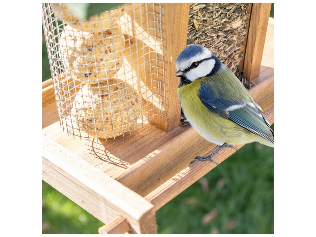 Kŕmidlo je možné rýchlo a jednoducho naplniť väčším množstvom krmiva – nie je teda potrebné ho neustále dopĺňať. Dopĺňanie je veľmi jednoduché – stačí zložiť strechu domčeka a pridať nové dobroty, ako sú lojové gule, orechy či podstielka. Vďaka pevným plexisklám ľahko uvidíte, kedy je potrebné kŕmidlo znovu doplniť. Krmivo je zároveň ideálne chránené pred vlhkosťou. Malí návštevníci, ako vrabce, červienky a iné vtáčiky, sa môžu usadiť na dvoch bočných bidlách a pohodlne zobkať zrno zo sila.