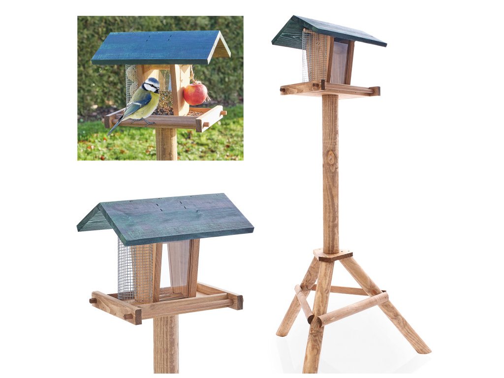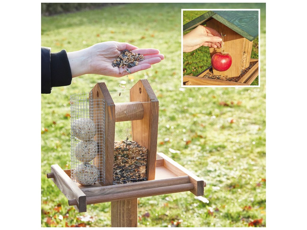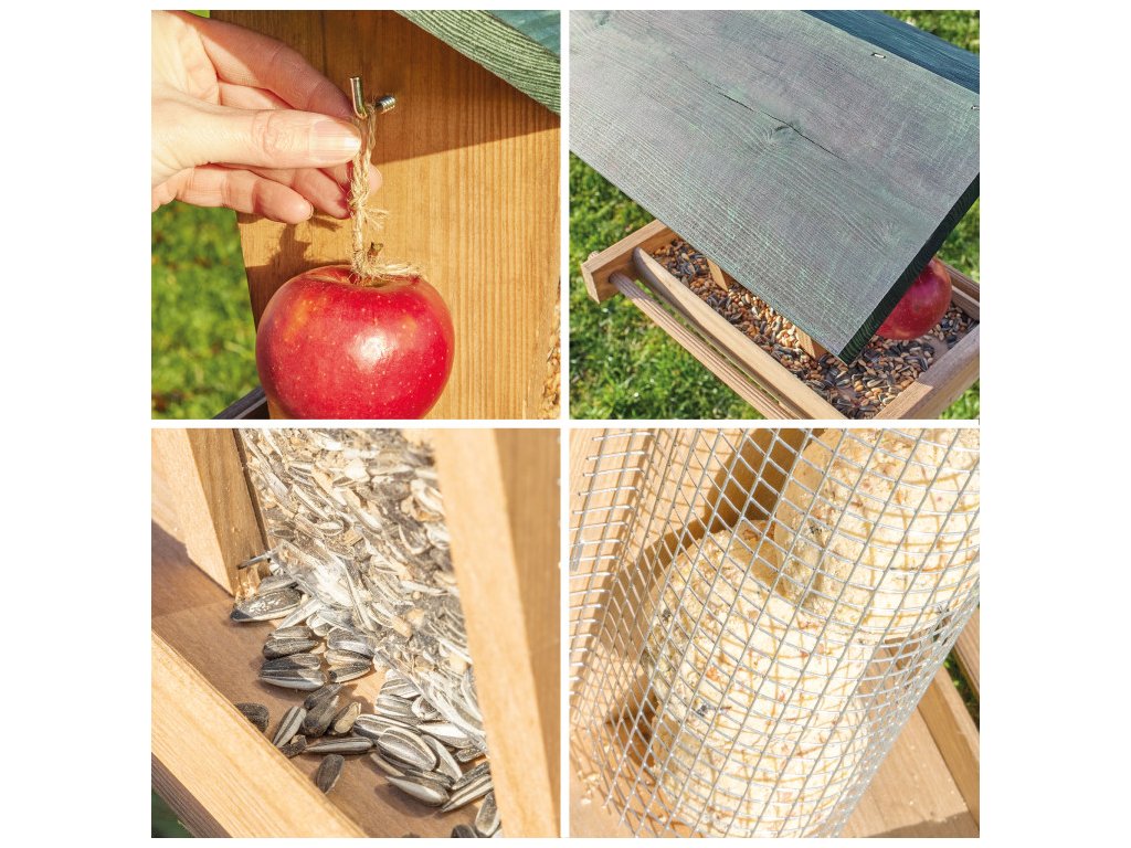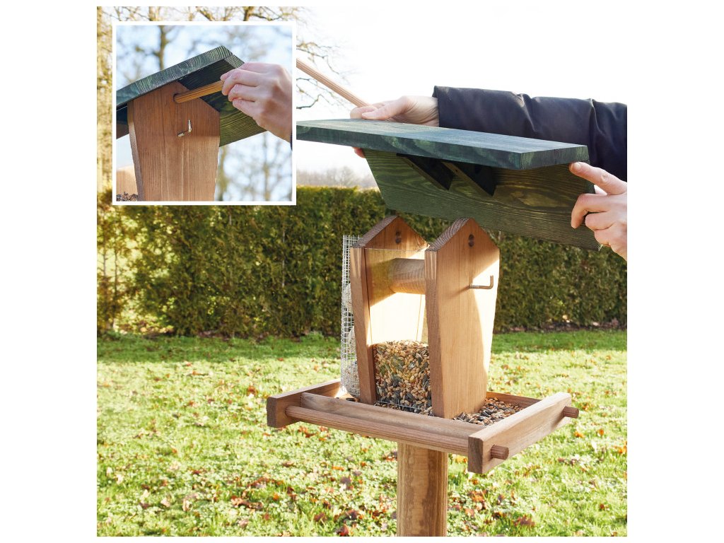 Vďaka stabilnému stojanu je toto krásne kŕmidlo jednoduché umiestniť na záhrade, terase alebo balkóne. Kŕmidlo je navyše možné rýchlo a jednoducho naplniť väčším množstvom krmiva, takže ho nie je potrebné často dopĺňať. Stačí jednoducho zložiť strechu a pridať nové krmivo, ako sú lojové gule, orechy alebo sypké zmesi.