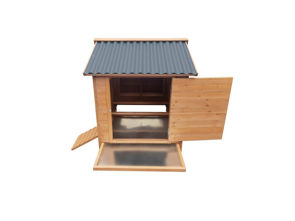 Pre ľahký prístup je kurník vybavený hneď dvoma dvierkami. Jedny dvierka sú umiestnené z prednej strany kurníka, druhé väčšie zo zadnej strany a obe sú opatrené kaštieľmi, aby ich nemohol žiadny predátor otvoriť. Väčšie dvierka slúžia na jednoduchú výmenu vody, kŕmenie a dobrú dostupnosť do kurníka pri čistení. Čistenie kurníka zvládnete hravo počas chvíľky cez otvorené zadné dvierka. Tiež čistenie znáškového hniezda nebude problém, vďaka výklopnej strieške. Kurník je vybavený zásuvkou na ľahké vyprázdňovanie trusu.