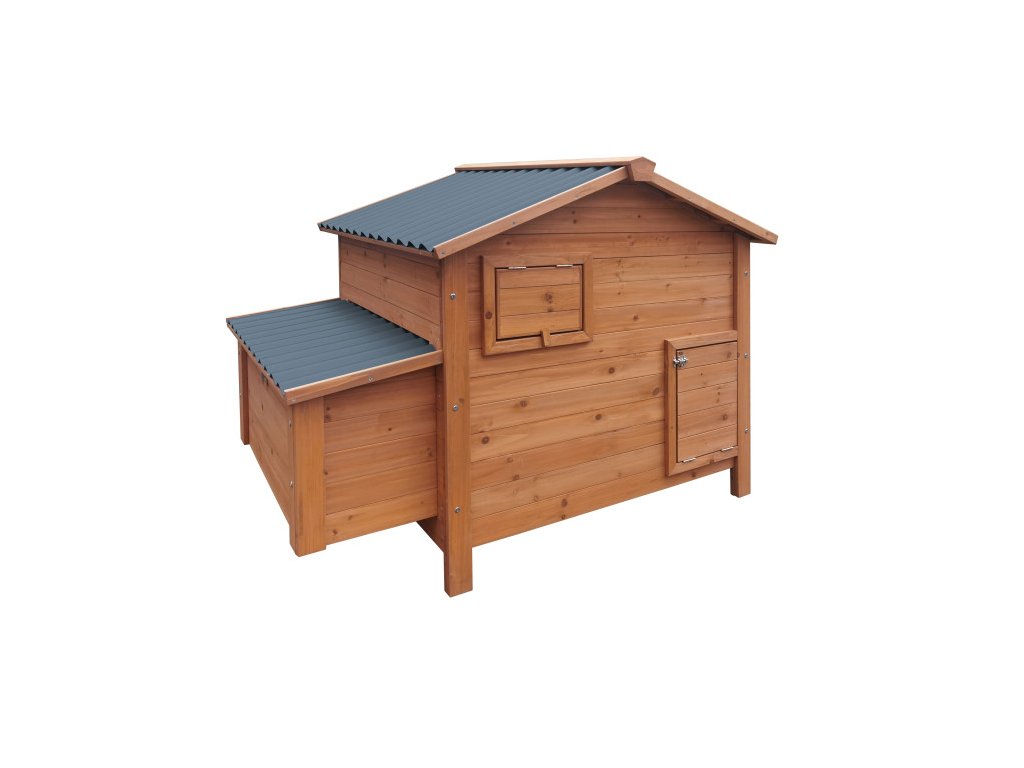 Kurník vyrobený z borovicového dreva má hmotnosť cca 40 kg a zaisťuje tak veľkú stabilitu. Pre efektívne odvetrávanie podlahy je umiestnený na štyroch zvýšených nôžkach. Aj napriek absencii zateplenia zostávajú nosnice v kurníku aj v znáškových hniezdach chránené odolnou PVC strechou, čo predstavuje opatrenie proti slnečnému žiareniu. Avšak odporúčame umiestniť kurník pod nejaký druh prístrešku, aby bol uchránený pred nepriaznivými vplyvmi počasia, vrátane dažďa, snehu a slnečného žiarenia. Drevený kurník je povrchovo ošetrený základným ochranným náterom. Pre dlhšiu životnosť treba, ako pri každom dreve, ochranný náter obnovovať.