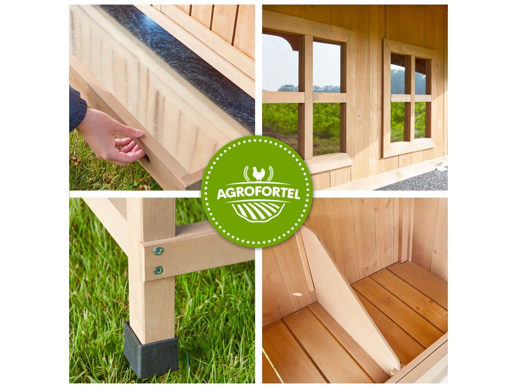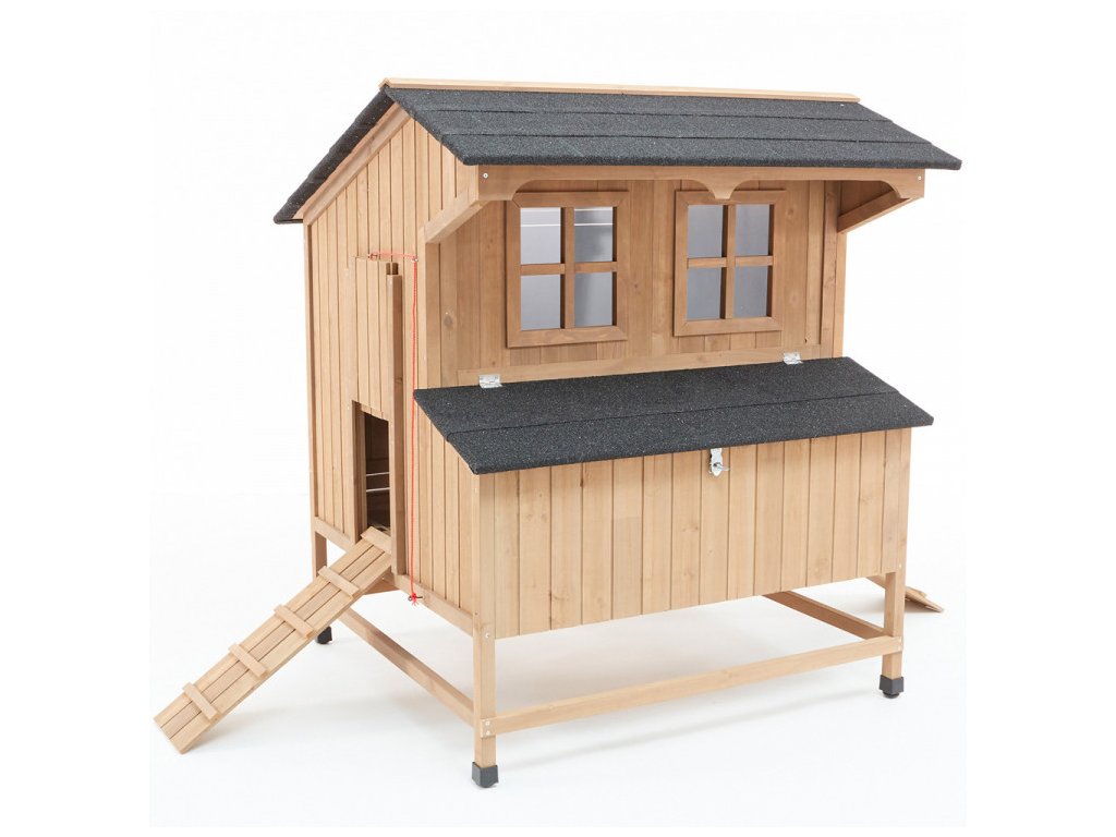Kurník vyrobený z borovicového dreva má hmotnosť cca 44 kg a zaisťuje tak veľkú stabilitu. Pre efektívne odvetrávanie podlahy je umiestnený na štyroch zvýšených nôžkach. Aj napriek absencii zateplenia zostávajú nosnice pod strechou kurníka aj v znáškových hniezdach chránené asfaltovou krytinou, čo predstavuje opatrenie proti slnečnému žiareniu. Avšak odporúčame umiestniť kurník pod nejaký druh prístrešku, aby bol uchránený pred nepriaznivými vplyvmi počasia, vrátane dažďa, snehu a slnečného žiarenia. Drevený kurník je povrchovo ošetrený základným ochranným náterom. Pre dlhšiu životnosť treba, ako pri každom dreve, ochranný náter obnovovať.