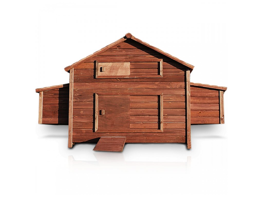 Kurník vyrobený zo smrekového dreva má hmotnosť cca 37 kg a zaisťuje tak veľkú stabilitu. Pre efektívne odvetrávanie podlahy je umiestnený na štyroch zvýšených nôžkach. Aj napriek absencii zateplenia zostávajú nosnice pod strechou kurníka aj v znáškových hniezdach chránené. Avšak odporúčame umiestniť kurník pod nejaký druh prístrešku, aby bol uchránený pred nepriaznivými vplyvmi počasia, vrátane dažďa, snehu a slnečného žiarenia. Drevený kurník je povrchovo ošetrený základným ochranným náterom. Pre dlhšiu životnosť treba, ako pri každom dreve, ochranný náter obnovovať. Cirkuláciu vzduchu v kurníku zaisťuje predné okienko.
