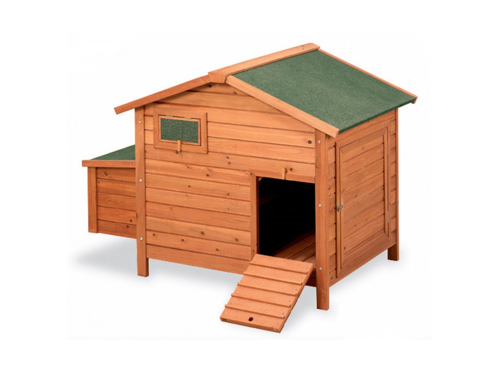 Kurník vyrobený z borovicového dreva má hmotnosť cca 37 kg a zaisťuje tak veľkú stabilitu. Pre efektívne odvetrávanie podlahy je umiestnený na štyroch zvýšených nôžkach. Aj napriek absencii zateplenia zostávajú nosnice pod strechou kurníka aj v znáškových hniezdach chránené. Avšak odporúčame umiestniť kurník pod nejaký druh prístrešku, aby bol uchránený pred nepriaznivými vplyvmi počasia, vrátane dažďa, snehu a slnečného žiarenia. Drevený kurník je povrchovo ošetrený základným ochranným náterom. Pre dlhšiu životnosť treba, ako pri každom dreve, ochranný náter obnovovať. Cirkuláciu vzduchu v kurníku zaisťuje predné okienko.