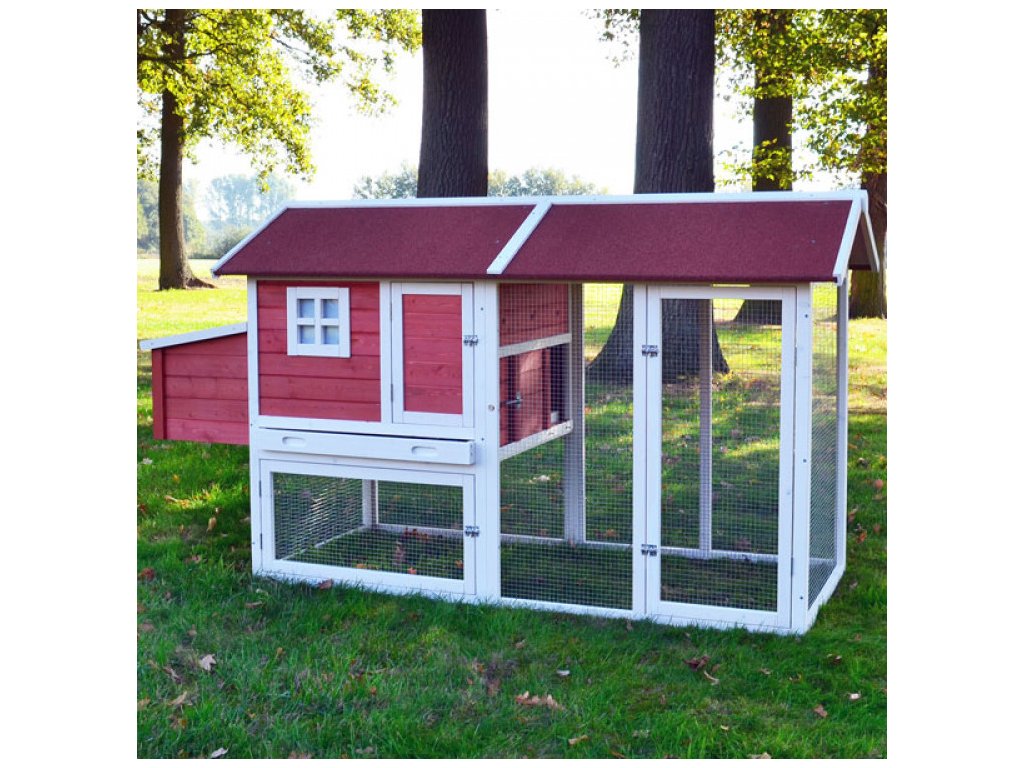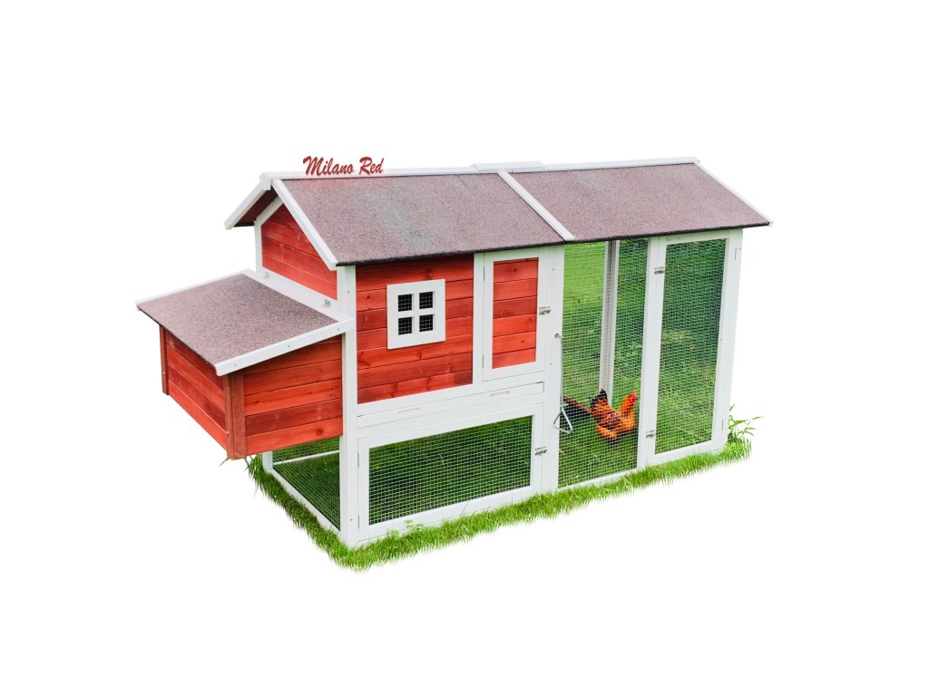 Kurník pre sliepky MILÁNO RED MAXI s výbehom má rozmery 220 x 74 x 120 cm a je vhodný na chov 7-8 sliepok, má 2 vodotesné znáškové hniezda a 2 vnútorné bidlá. Kurník je vyrobený zo smrekového dreva s vodotesnou strechou. Výhodou je výsuvný trusník a dvoje dvierka.