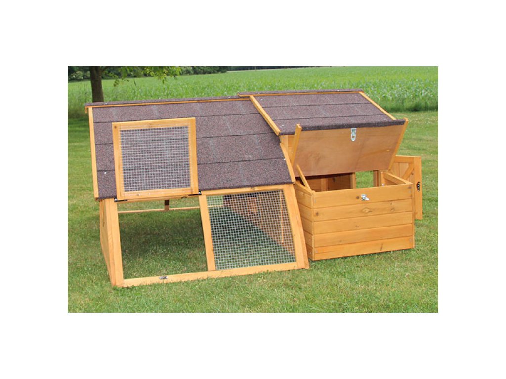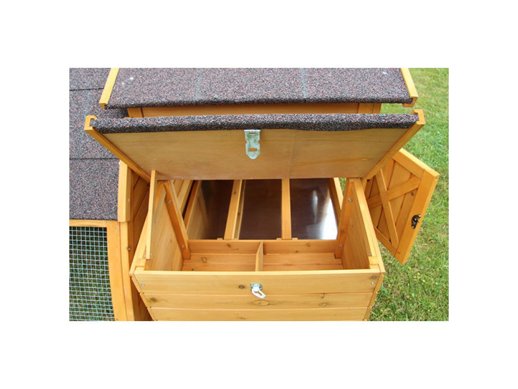 Pre jednoduchý prístup je kurník vybavený hned dvojicou dvierok. Jedny dvierka sú umiestnené z prednej strany kurníka, druhé menšie zo zadnej strany a obe sú opatrené zámkami, aby ich nemohol žiadny predátor otvoriť. Väčšie dvierka slúžia pre jednoduchú výmenu vody, kŕmenie a dobrú dostupnosť do kurníka pri čistení. Druhé menšie výklopné dvierka umožnia sliepkam jednoduchý prístup do kurníka a von na záhradu alebo z výbehu. Čistenie kurníka zvládnete hravo počas chvíľky cez otvorené bočné dvierka. Takisto čistenie snáškového hniezda nebude problém, vďaka výklopnej streche. Kurník je vybavený zásuvkou pre jednoduché vyprazdňovanie trusu.