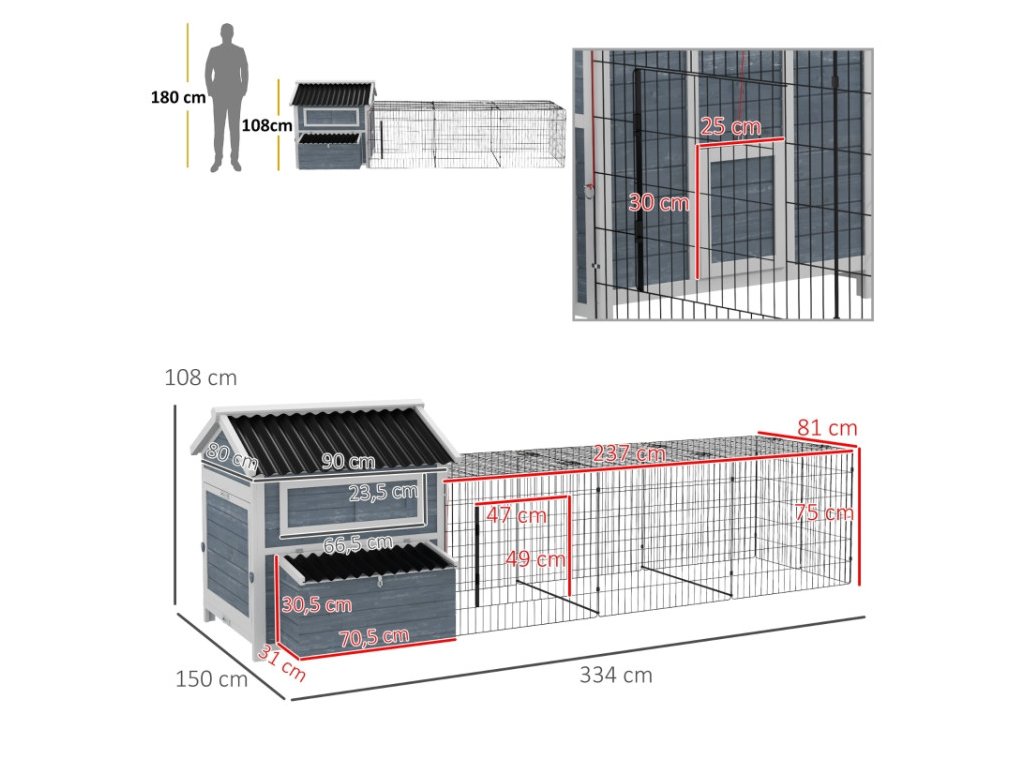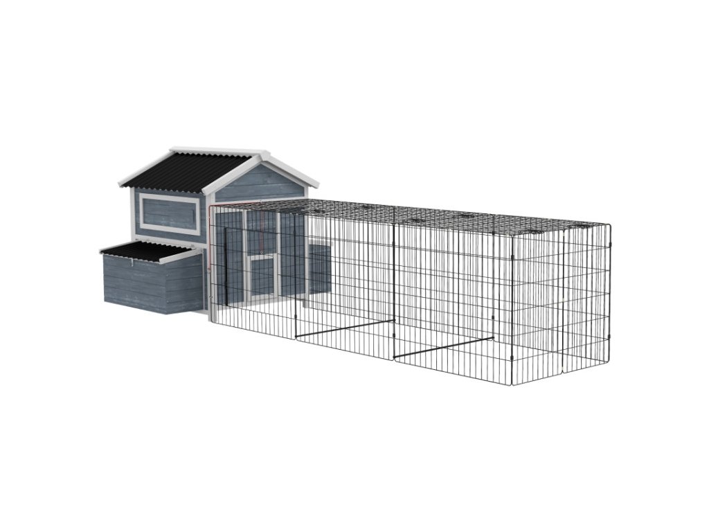 Špecifikácia kurníka: Celkové rozmery: 334 cm (dĺžka) × 150 cm (šírka) × 108 cm (výška). Obytný priestor: 90 × 80 × 98 cm. Výbeh: 237 × 81 × 75 cm. Vhodné pre 4–6 sliepočiek.