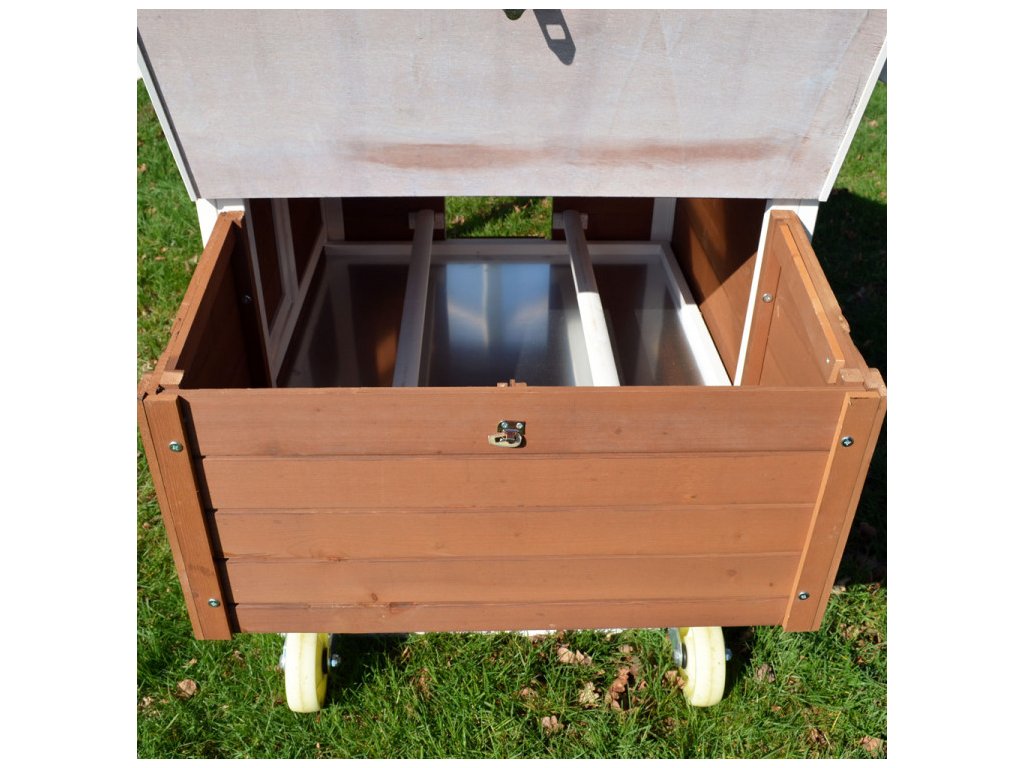 Pre jednoduchý prístup je kurník vybavený hneď dvomi dvierkami. Jedny dvierka sú umiestnené z prednej strany kurníka, druhý vstup je z bočnej strany, otvorený, s protisklzovou rampou. Samotný výbeh je vybavený dvierkami pre Váš jednoduchý prístup pri výmene kŕmenia a vody. Čistenie kurníka zvládnete hravo počas chvíľky vďaka vysúvateľnému hnojníku. Takisto čistenie znáškového hniezda nebude problém, vďaka vyklápacej streche.