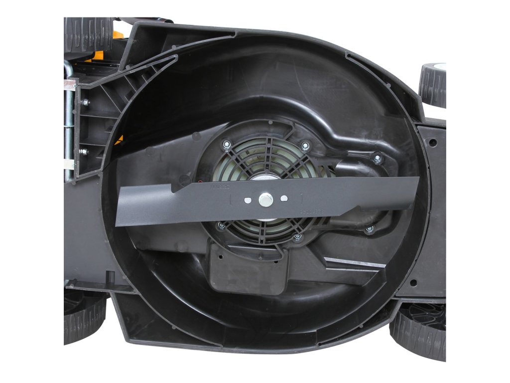 Kosačka je poháňaná výkonným 1800 W motorom. Prevod otáčok pomocou malého klinového remeňa výrazne zvyšuje točivý moment stroja (viac sily aj v hustejšej tráve) a pri náraze noža na prekážku zabráni spáleniu motora a tým pádom aj drahej oprave. Motor je tichý a bezúdržbový s dlhou životnosťou. Výhodou tejto kosačky je tiež veľmi jednoduché nastavenie výšky kosenia ktoré sa nastavuje pákou umiestnenou na šasi v rozsahu 25 až 80 mm.