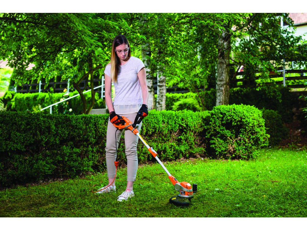 Vďaka hlave motora, ktorú je možné na dosiahnutie pohodlného kosenia na zvislých plochách otáčať o 180° a naklápať do troch polôh, je prístroj univerzálne využiteľný. Jeho plynule posuvné teleskopické držadlo z hliníka s nastaviteľnou prídavnou rukoväťou umožňuje pohodlné obojručné vedenie a presné prispôsobenie veľkosti tela pre elimináciu únavy pri práci. Kryt a prídavná rukoväť sú vyrobené z vysokokvalitného, húževnatého plastu. Prívodný kábel vyžínača je chránený pred opotrebením a poškodením držiakom kábla pre odľahčenie ťahu, prídavný ochranný kryt chráni užívateľa pred zvieranými časticami, ako sú kamene alebo drevené triesky.