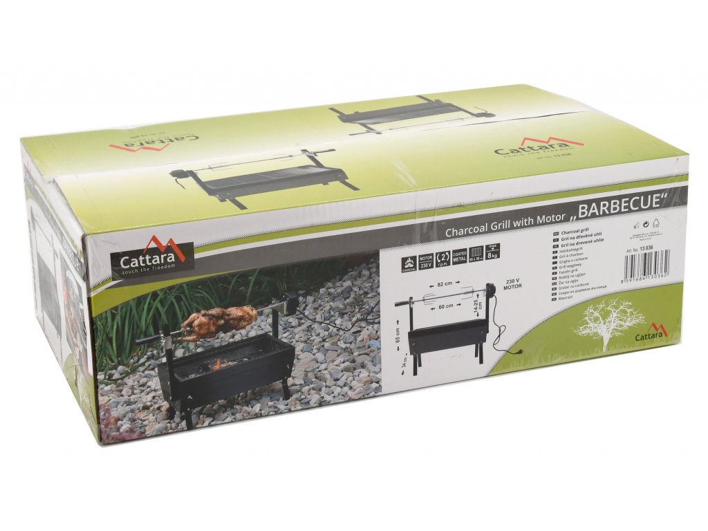 Gril na drevené uhlie s robustnou konštrukciou CATTARA BARBECUE s motorom na otáčanie pokrmov. Stabilná konštrukcia grilu je z kvalitnej ocele, ktorá je opatrená odolnou čiernou farbou. Kovové nohy zvyšujú stabilitu grilu.