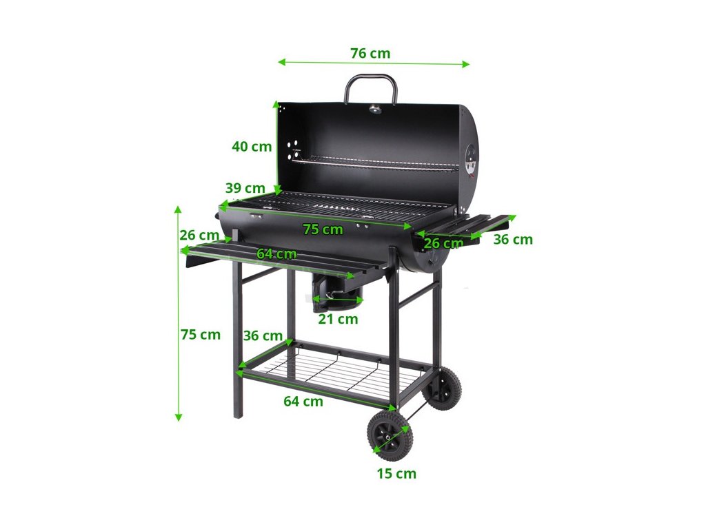 Gril si poradí s drevom, dreveným uhlím aj briketami. Samotný gril je vyrobený z kvalitnej ocele a je ošetrený čiernym práškovým lakovaním, ktoré zaistí nie len dlhú trvanlivosť grilu, ale tiež zdravotnú nezávadnosť pripravovaných pokrmov.