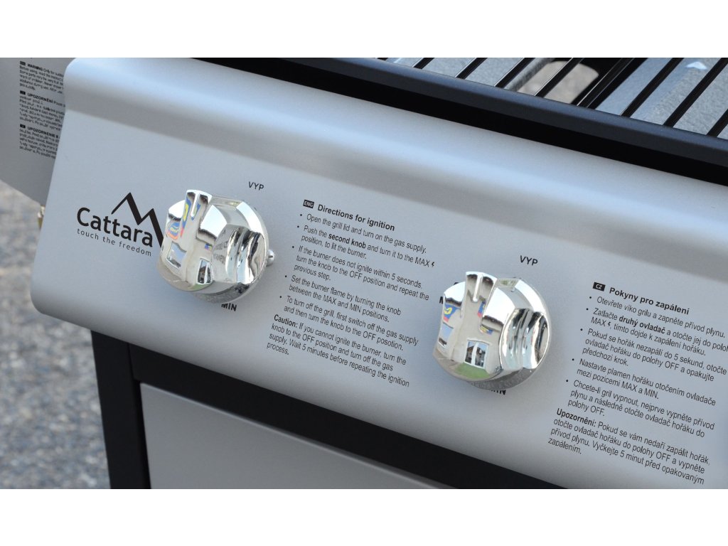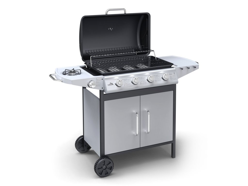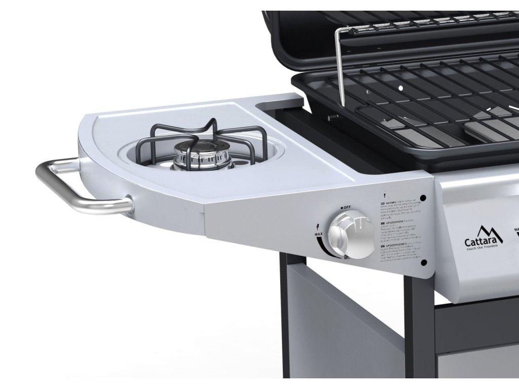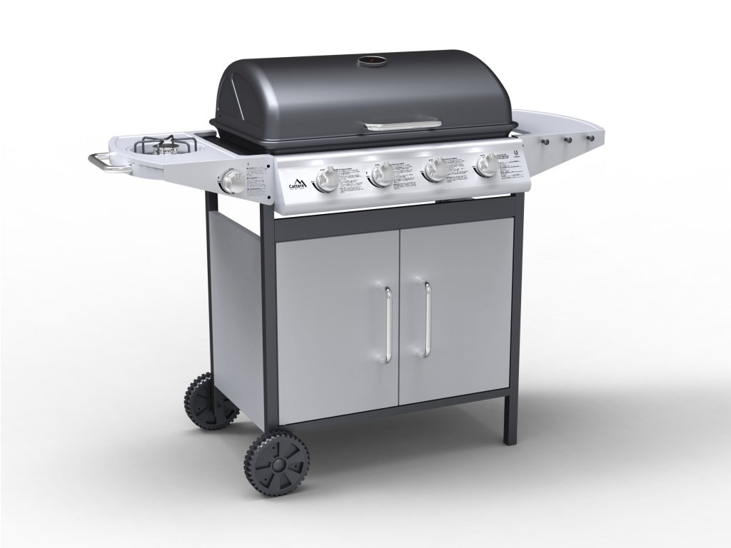 Pojazdný, záhradný, plynový gril Master Cheef českého výrobcu Cattara so 4 horákmi, sklopným vekom a bočným varičom.