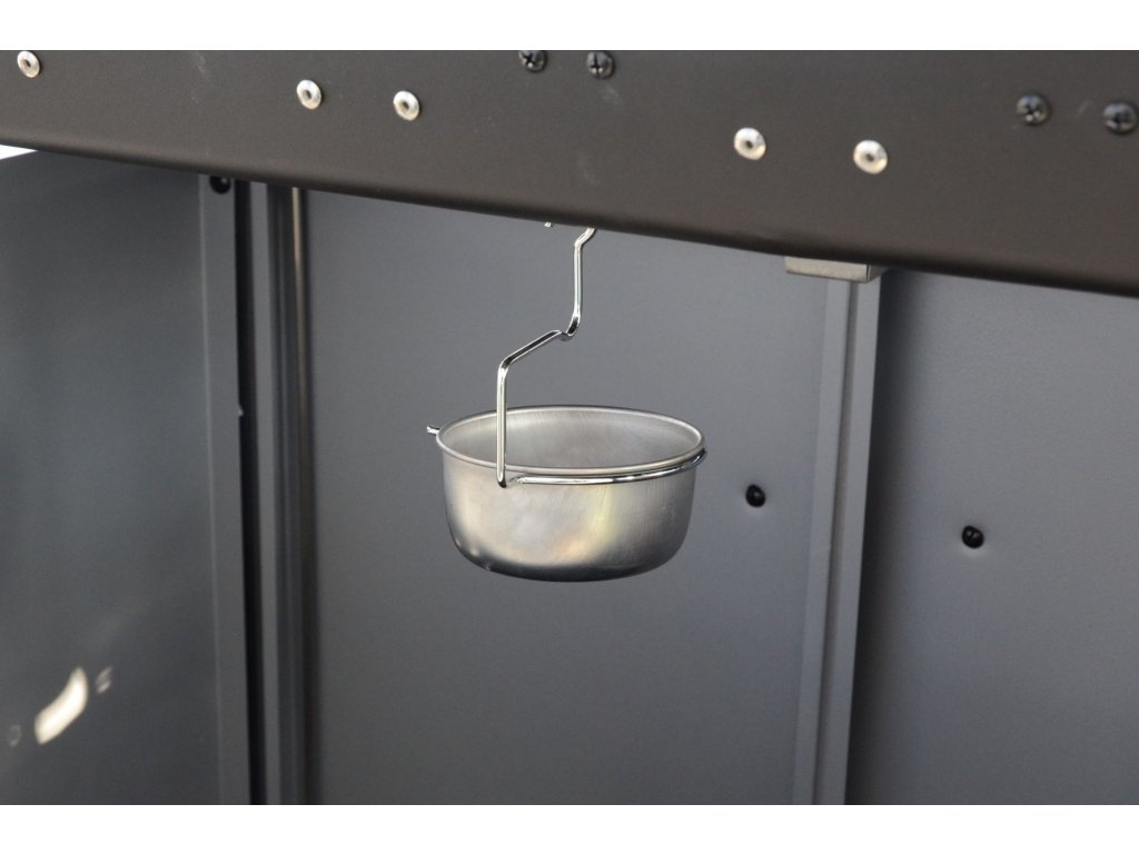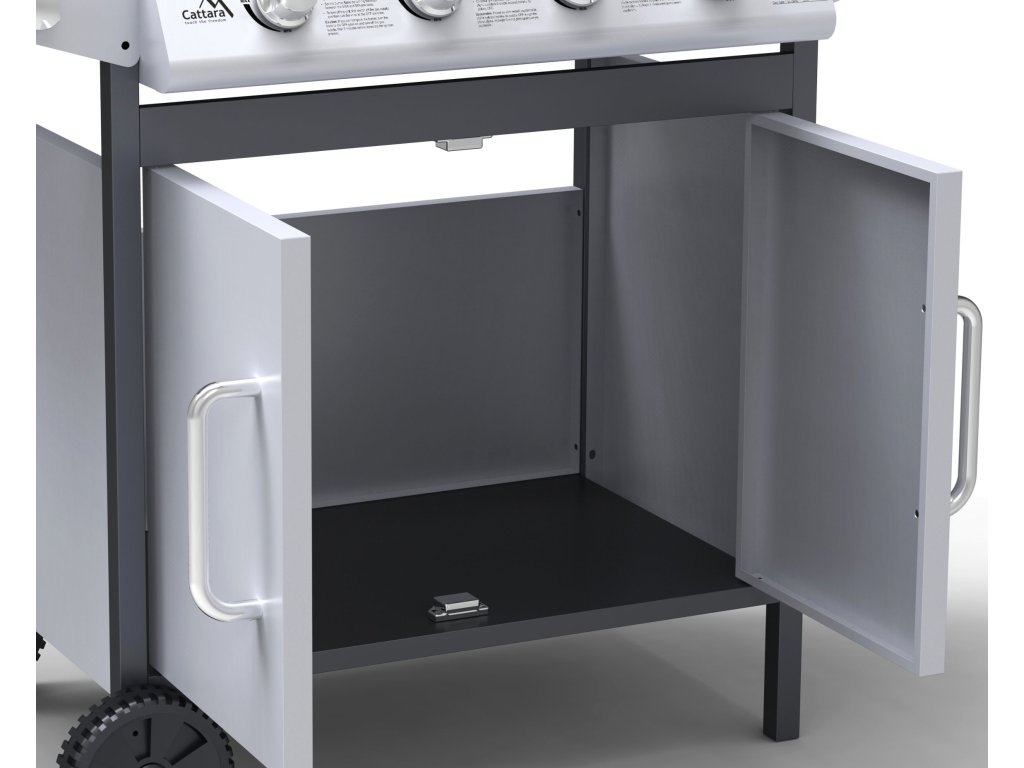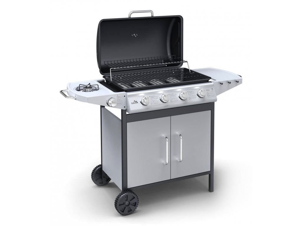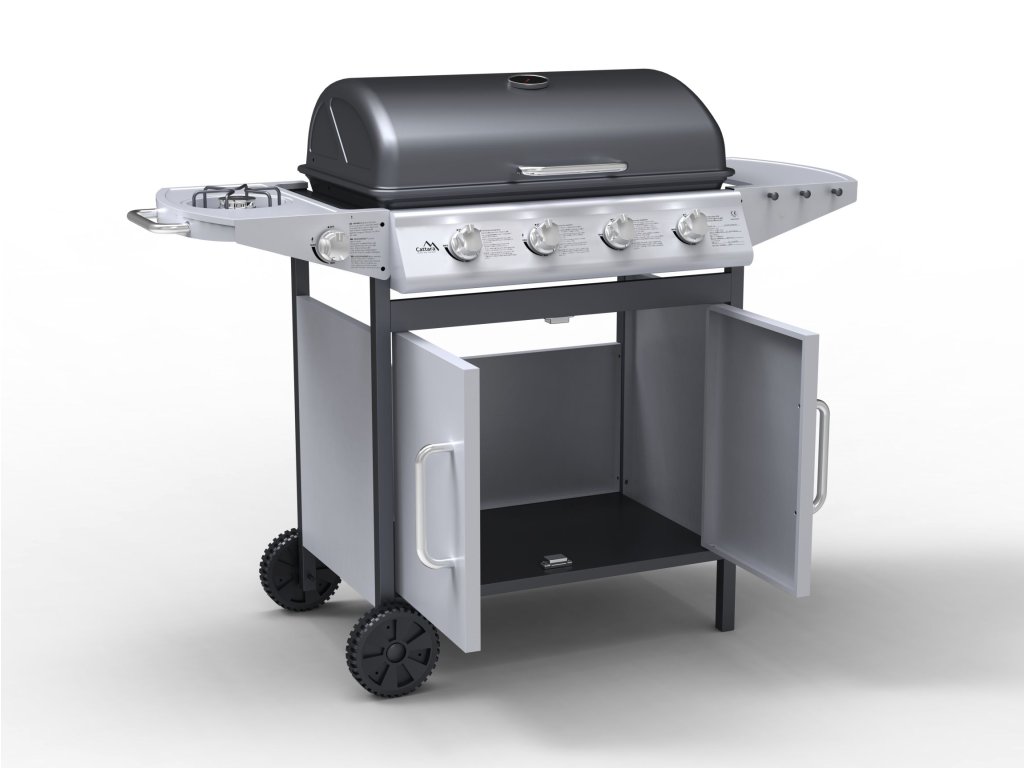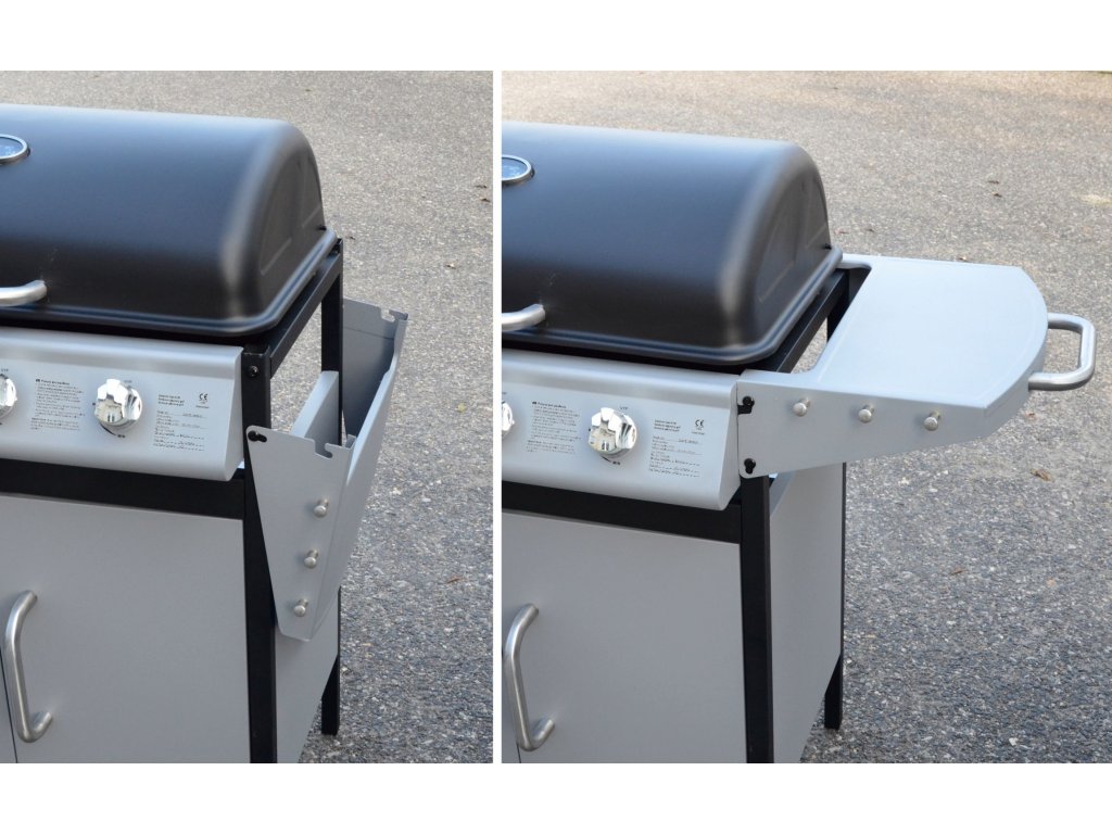 Gril je pojazdný (2 kolieska), osadený sklopným vekom s teplomerom a odkladacími poličkami na príslušenstvo. Ďalej je doplnený bočným varičom so samostatnou reguláciou a piezo zapaľovaním. V strednej časti je objemný, uzatvárateľná skrinka s dvierkami. Vďaka sklopnej bočnej poličke sa gril jednoducho skladuje.