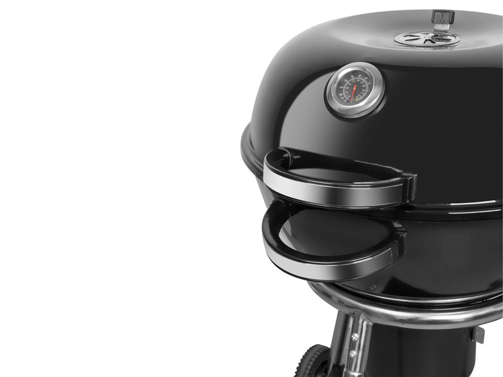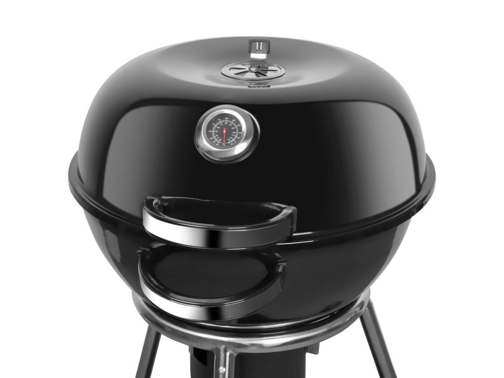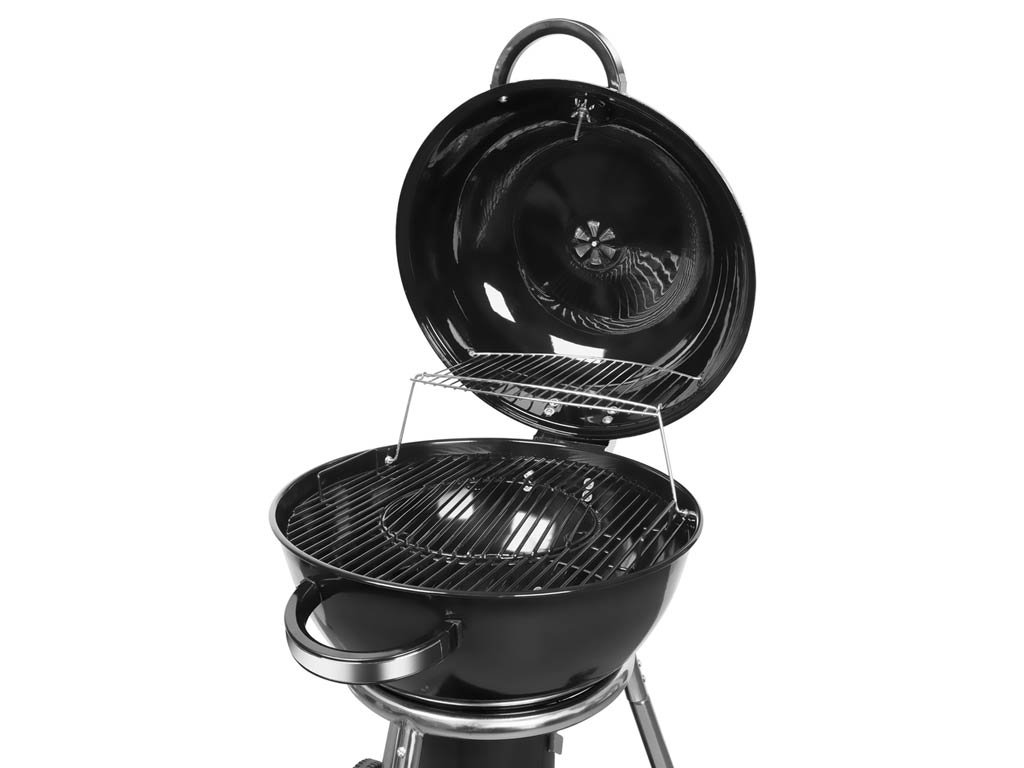 Veko je špeciálne navrhnuté tak, aby ste ho po otvorení nemuseli držať v ruke. Praktický pánt ho drží v otvorenej polohe. Stabilná oceľová konštrukcia zaistí, že sa gril pri grilovaní neprevrhne. Gril má dve pevné madlá a je postavený na 3 kovových nohách, pričom dve z nich sú zakončené kolieskami, vďaka ktorým ste schopný bezpečne a bez väčšej námahy s grilom manipulovať.