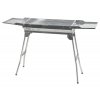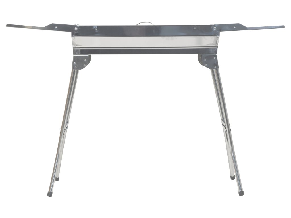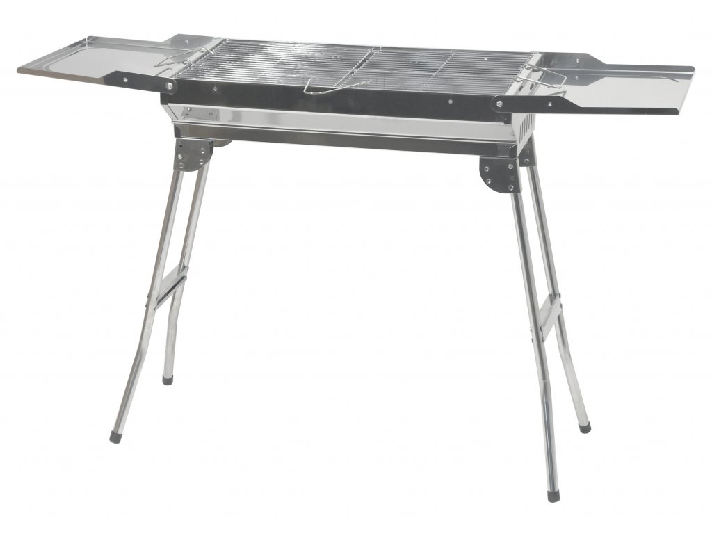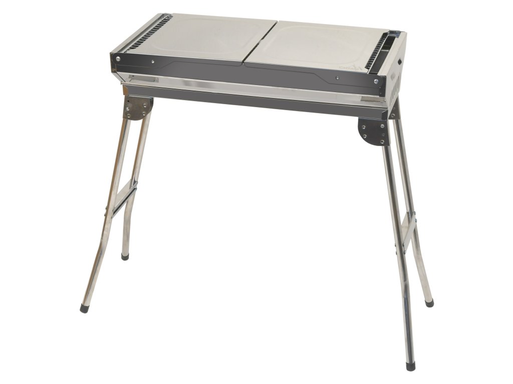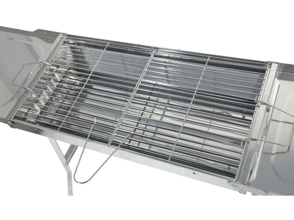 Konštrukcia je vyrobená z kvalitnej nerezovej ocele s lesklým povrchom. Stabilitu zaisťujú vyklápacie nohy. Rozmery grilu 112 x 30 x 71 cm.