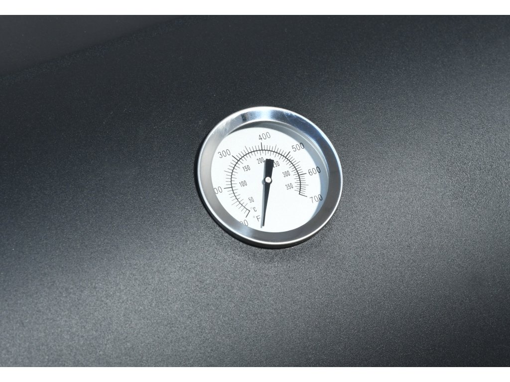 Pre odkladanie alebo prípravu pokrmov môžete využívať praktickú políciu, ktorá je umiestnená v prednej časti grilu. Aby ste mali neustále prehľad o teplote, je v sklopnom veku grilu zabudovaný teplomer. Vďaka dvom vstavaným kolieskam môžete s grilom jednoducho manipulovať.