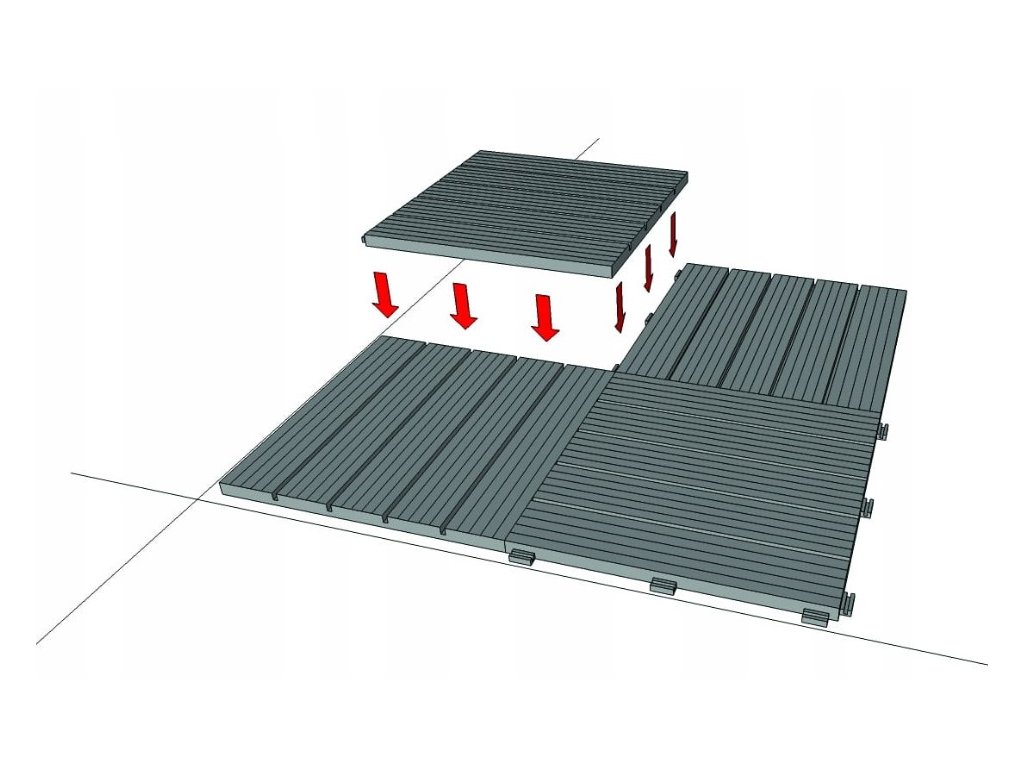 Podlahu môžete mať položenú behom pár hodín alebo za jedno popoludnie - záleží na veľkosti priestoru, kam dlažbu budete pokladať. Dlaždice majú praktické drážky, ktoré slúžia na odtok prebytočnej vody. Vďaka tomu sa voda nezhromažďuje medzi dlažbou a podkladom a nevznikne pleseň. Rovné dosadacie plochy zospodu dlaždice neponičia hydroizoláciu na vašej terase. Medzi izoláciu a dlažbu nemusíte vkladať ďalšiu tkaninu. Dlažba sa upevňuje pomocou bočných spojovacích háčikov, tzv. systémom Quick - Click. Prehľadný návod si môžete pozrieť na tomto odkaze.