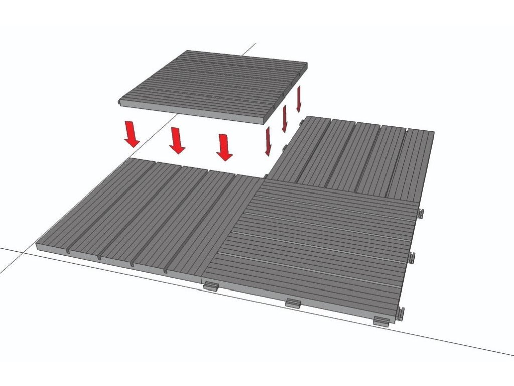 Podlahu môžete mať položenú behom pár hodín alebo za jedno popoludnie - záleží na veľkosti priestoru, kam dlažbu budete pokladať. Dlaždice majú praktické drážky, ktoré slúžia na odtok prebytočnej vody. Vďaka tomu sa voda nezhromažďuje medzi dlažbou a podkladom a nevznikne pleseň. Rovné dosadacie plochy zospodu dlaždice neponičia hydroizoláciu na vašej terase. Medzi izoláciu a dlažbu nemusíte vkladať ďalšiu tkaninu. Dlažba sa upevňuje pomocou bočných spojovacích háčikov, tzv. systémom Quick - Click. Prehľadný návod si môžete pozrieť na tomto odkaze.