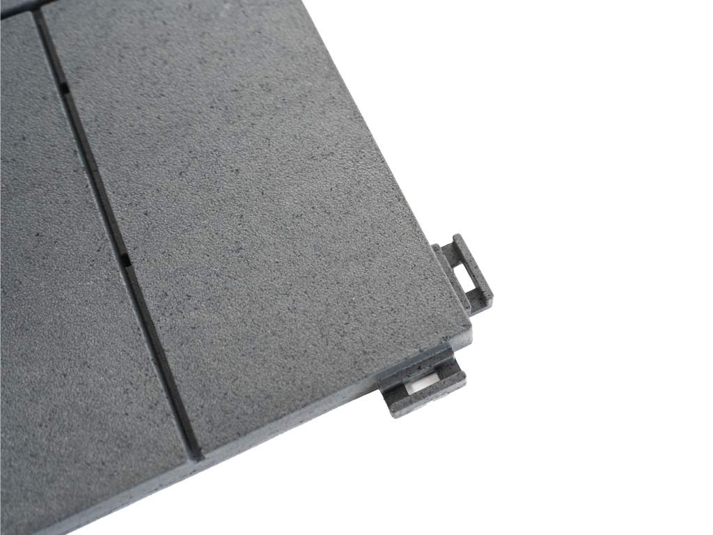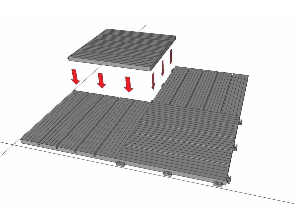 Podlahu môžete mať položenú behom pár hodín alebo za jedno popoludnie - záleží na veľkosti priestoru, kam dlažbu budete pokladať. Dlaždice majú praktické drážky, ktoré slúžia na odtok prebytočnej vody. Vďaka tomu sa voda nezhromažďuje medzi dlažbou a podkladom a nevznikne pleseň. Rovné dosadacie plochy zospodu dlaždice neponičia hydroizoláciu na vašej terase. Medzi izoláciu a dlažbu nemusíte vkladať ďalšiu tkaninu. Dlažba sa upevňuje pomocou bočných spojovacích háčikov, tzv. systémom Quick - Click. Prehľadný návod si môžete pozrieť na tomto odkaze.