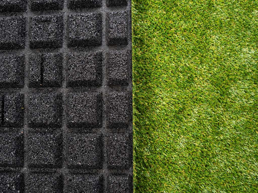 - Kombinácia umelého trávnika a gumovej dlaždice pre odolný a estetický povrch