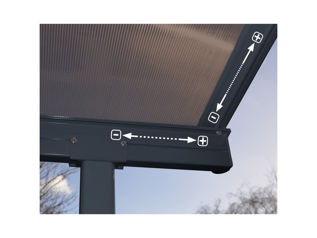 Bezúdržbový hliníkový rám s galvanicky ošetrenými kovovými prvkami je ošetrený práškovou farbou a je vysoko odolný voči hrdzi, plesniam či machom. Vďaka nastaviteľnej výške ukotvenia a posuvným oporným nohám vyhovuje väčšine bežných veránd. Možno využiť z boku domu ako prístrešok pre auto a vybaviť LED osvetlením, krycou zástenou alebo bočnou stenou.