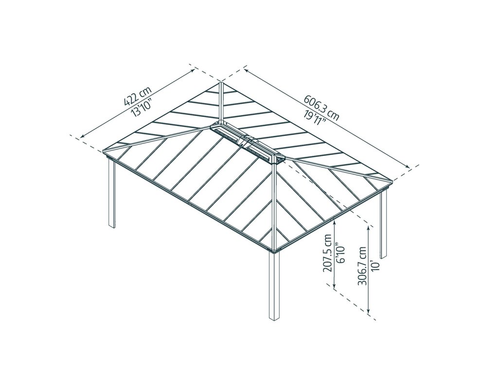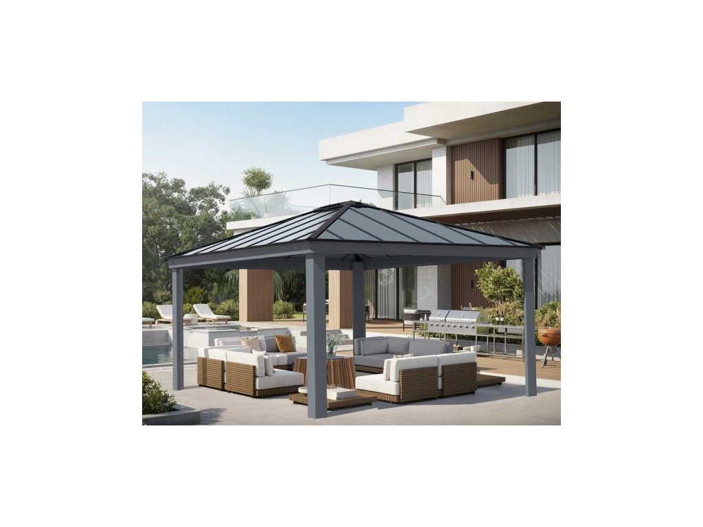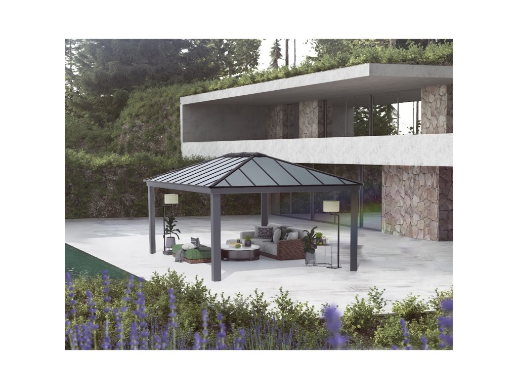 Luxusný záhradný hliníkový altán od značky PALRAM Dallas 14 x 20 je ideálnou voľbou pre tých, ktorí hľadajú elegantný a priestranný prístrešok na relaxáciu, posedenie s rodinou alebo priateľmi. Altán je perfektným zastrešením vonkajšieho posedenia, grilu alebo vonkajšej vírivky. Hliníková konštrukcia je v antracitovej farbe. Masívna konštrukcia z hliníkových profilov je navyše odolná voči korózii, čo znamená, že sa nemusíte starať o natieranie, hnilobu, mach alebo drevokazný hmyz, ako tomu býva pri drevených konštrukciách.