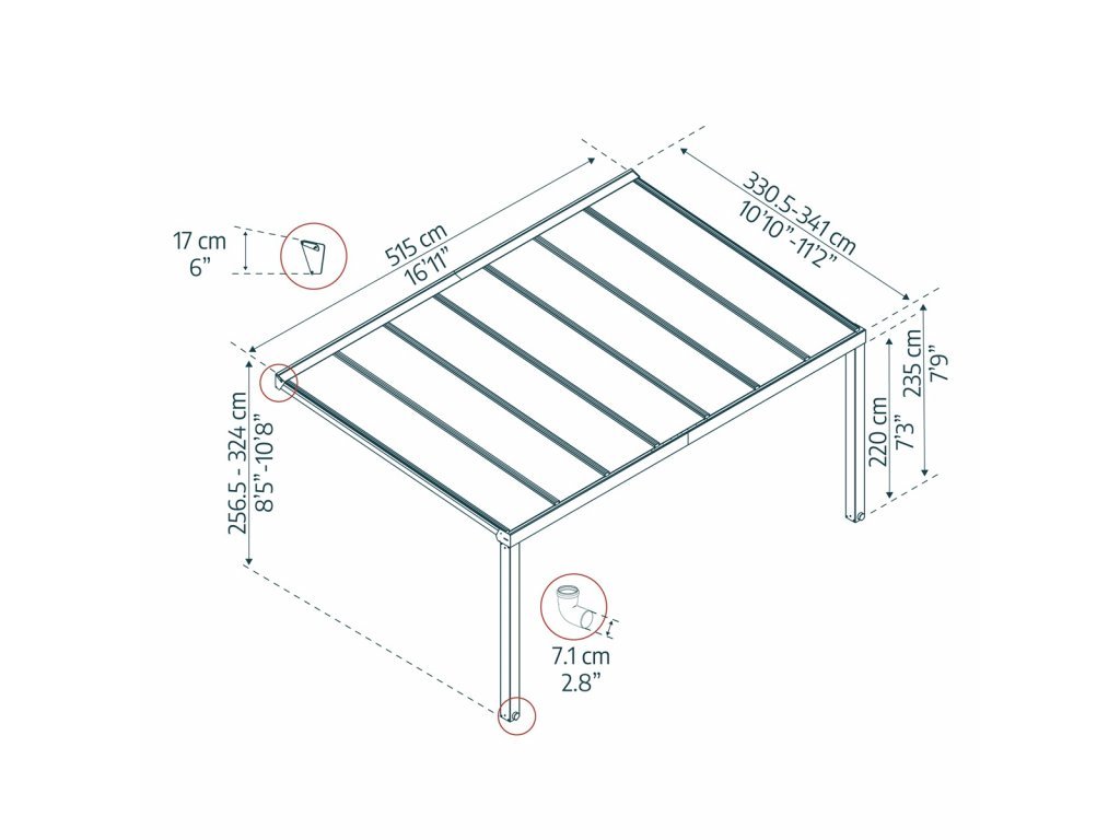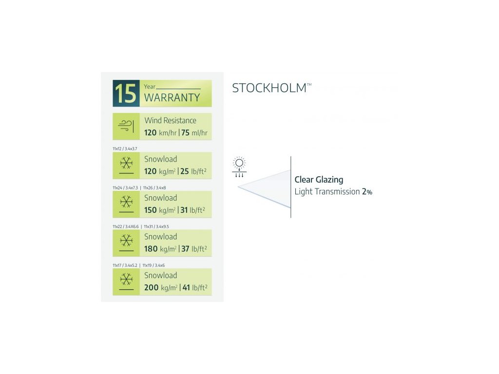 Táto hliníková pergola patrí do produktovej radu Štokholm a má rozmery 3,41 x 3,24 x 5,15 m (Š x V x H). Je určená k stene domu, má 2 oporné stĺpy a je vyrobená z hliníka s antracitovou farbou konštrukcie a čírym polykarbonátovým presklením s hrúbkou 4 mm s UV ochranou. Hmotnosť (netto) pergoly je 215 kg a rozmery balenia sú 336 x 76 x 45 cm. Pergola bude doručená prepravnou službou na palete, hmotnosť sa pohybuje okolo 220 kilogramov v závislosti od rozmerov pergoly.