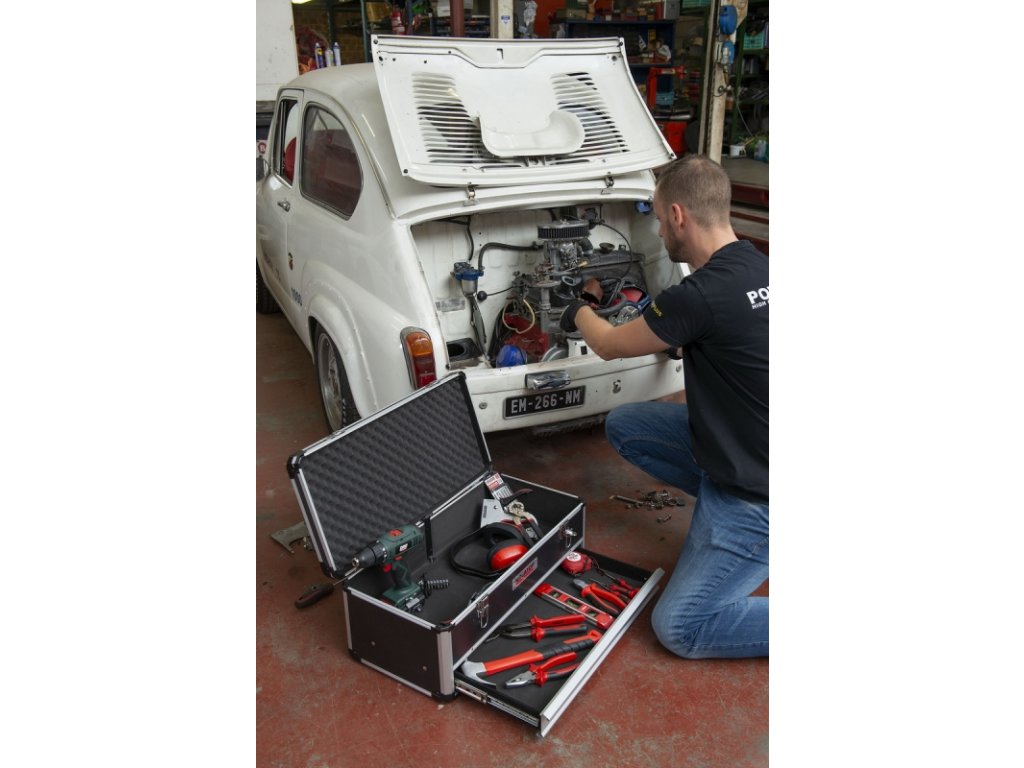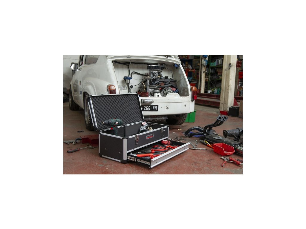 Zásuvkový hliníkový kufor značky KREATOR má rozmery 62 x 30 x 25,5 cm. Pevný box obsahuje polstrovanie bez priehradiek pre jednoduché uloženie väčších kusov náradia. Navyše má na dne zásuvku, kam prehľadne roztriedite menšie nástroje a materiál. Kufrík v čierno-striebornej farbe chráni vystuženie v rohoch. Samovoľnému otvoreniu bránia pevné kovové klipsy a uzamykanie na kľúč. Zásuvka má bezpečnostnú poistku proti náhodnému vysunutiu. Prenášanie uľahčuje integrované držadlo.