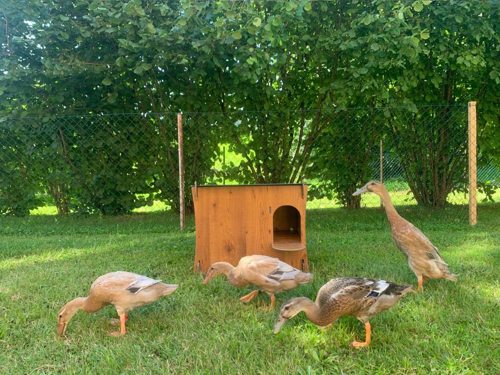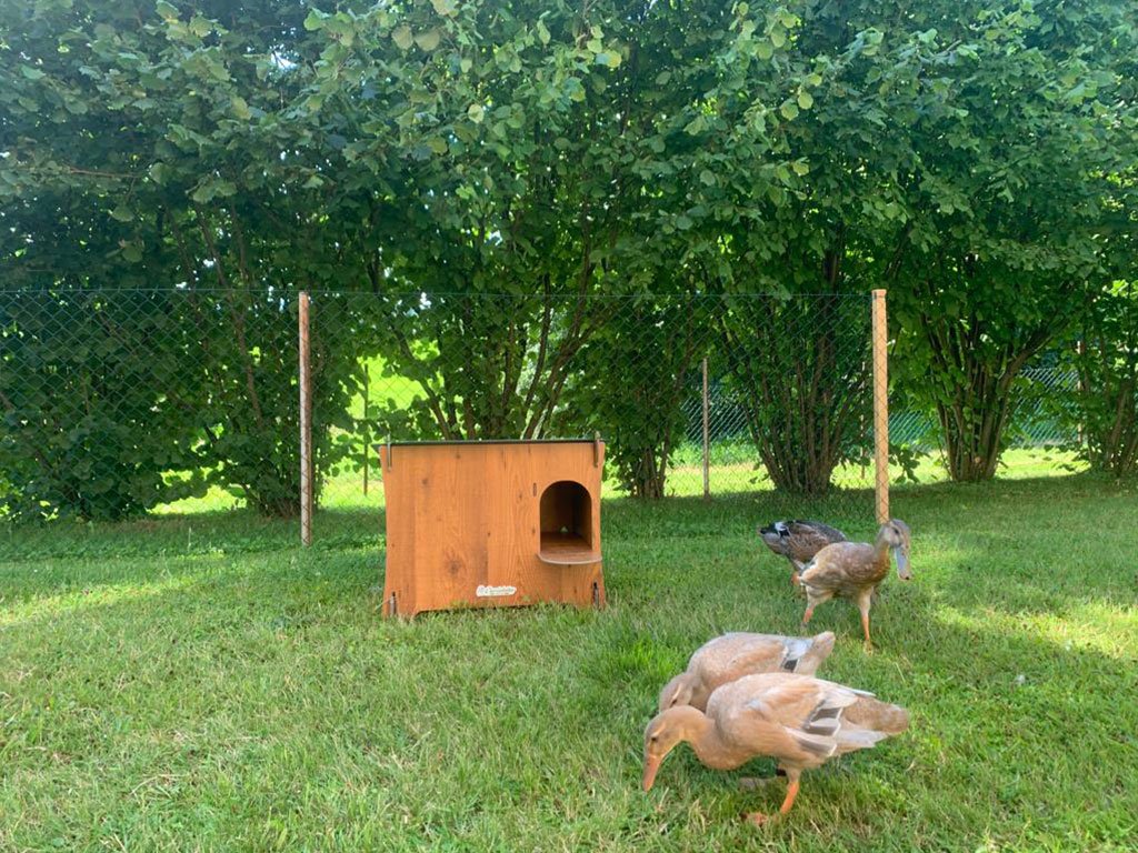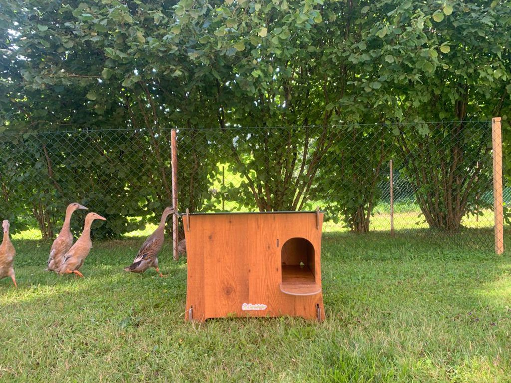 Domček pre kačky DUCKY M s rozmermi 70 x 56 x 54 cm je ideálny až pre štyroch indických bežcov. Jedná sa o veľmi pohodlný domček, ktorý má otváraciu strechu pre jednoduché čistenie. Domček pre kačky vyrobený z vysoko odolného HPL laminátu poskytuje vynikajúce tepelné i hygienické vlastnosti.
