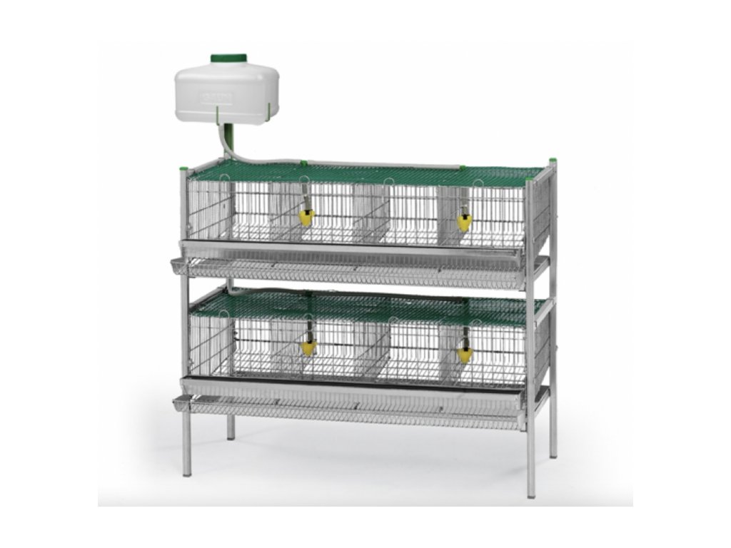 Dvojposchodová klietka pre prepelice, vhodná pre prepelice japonské či čínske. Súčasťou je kŕmny žľab, automatická napájačka s hadičkou, filter a nádrž na vodu s objemom 8,5 l. Klietka má rozmery 104,5 x 59 x 90 cm, rozmery jednotlivých oddelení sú 25 x 44 x 26 cm. Každé poschodie je určené pre cca 22 prepelíc. Varianta bez koliesok. Možnosť dokúpenia rozširujúcich poschodí. Maximálne je možné mať 4 rady klietok nad sebou.
