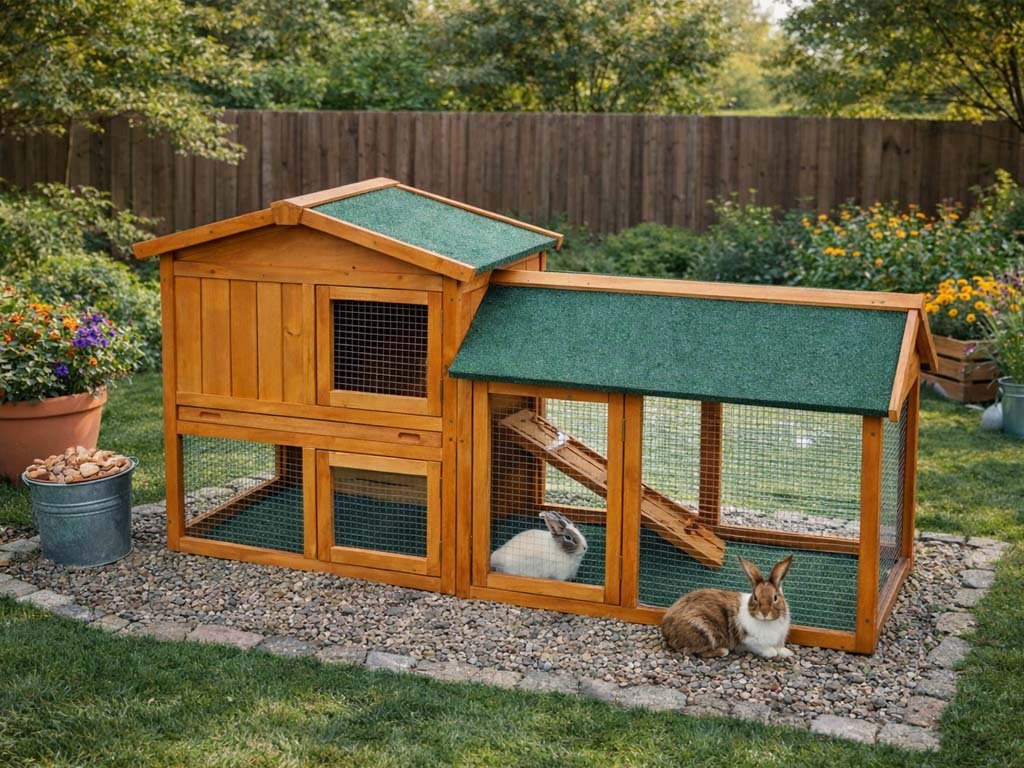 Benji králikáreň z jedľového dreva. Vhodné pre 4–6 malých zvierat. Strecha: drevo (sedlová). Rozmery: 146 cm × 54 cm × 86 cm. Vhodné pre 4–6 malých zvierat. Výsuvný pozinkovaný podnos pre snadné čistenie. Vodotesná asfaltová strecha, odolná proti dešti a UV žiarenie. Vysoce kvalitný drevená konstrukce. Snadná montáž.
