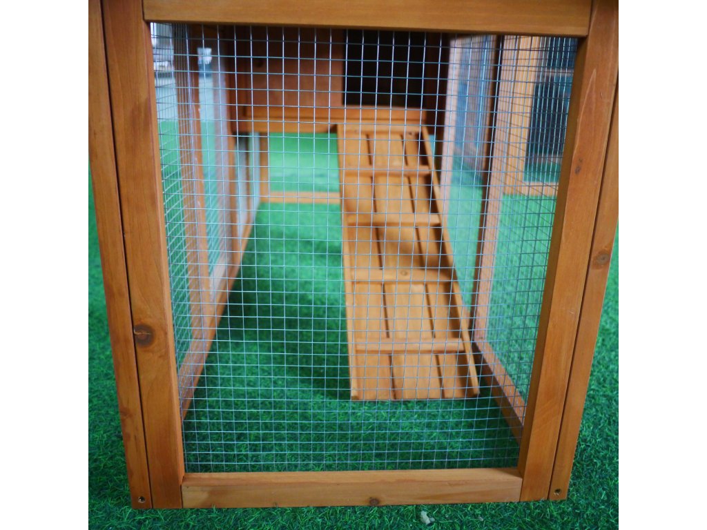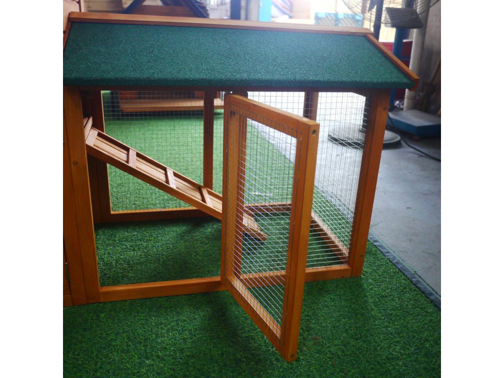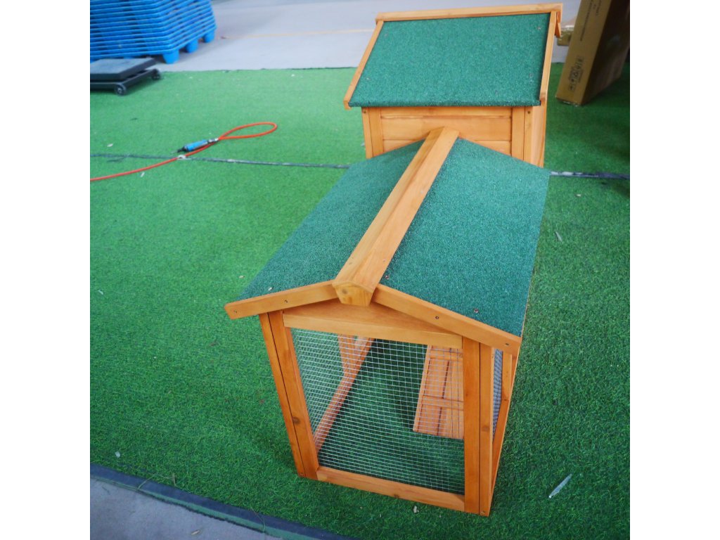 Vhodné pre 4–6 malých zvierat. Výsuvný pozinkovaný podnos pre snadné čistenie. Vodotesná asfaltová strecha, odolná proti dešti a UV žiarenie.