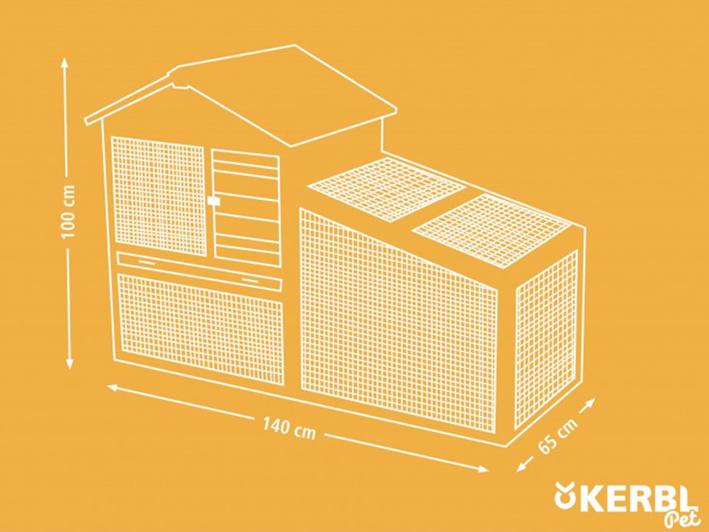 Drevená králikáreň KERBL FREETIME pre králiky, morčatá, činčily a iné hlodavce o rozmeroch 140 × 65 × 100 cm. Jedná sa o praktickú králikáreň s výbehom, ktorá je vybavená vyberateľným trusníkom pre ľahké čistenie. Bezproblémový prístup do králikárne zaisťujú predné a bočné dvierka.