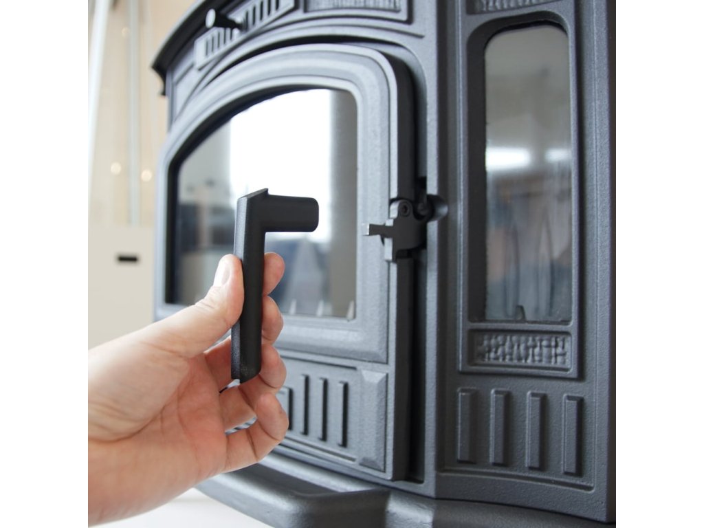 Predná časť kachlí je vybavená žiaruvzdorným keramickým sklom, ktoré odoláva teplotám až do 660 °C. Dekoratívna zábrana pomáha udržiavať poriadok a chráni pred vypadnutím dreva.