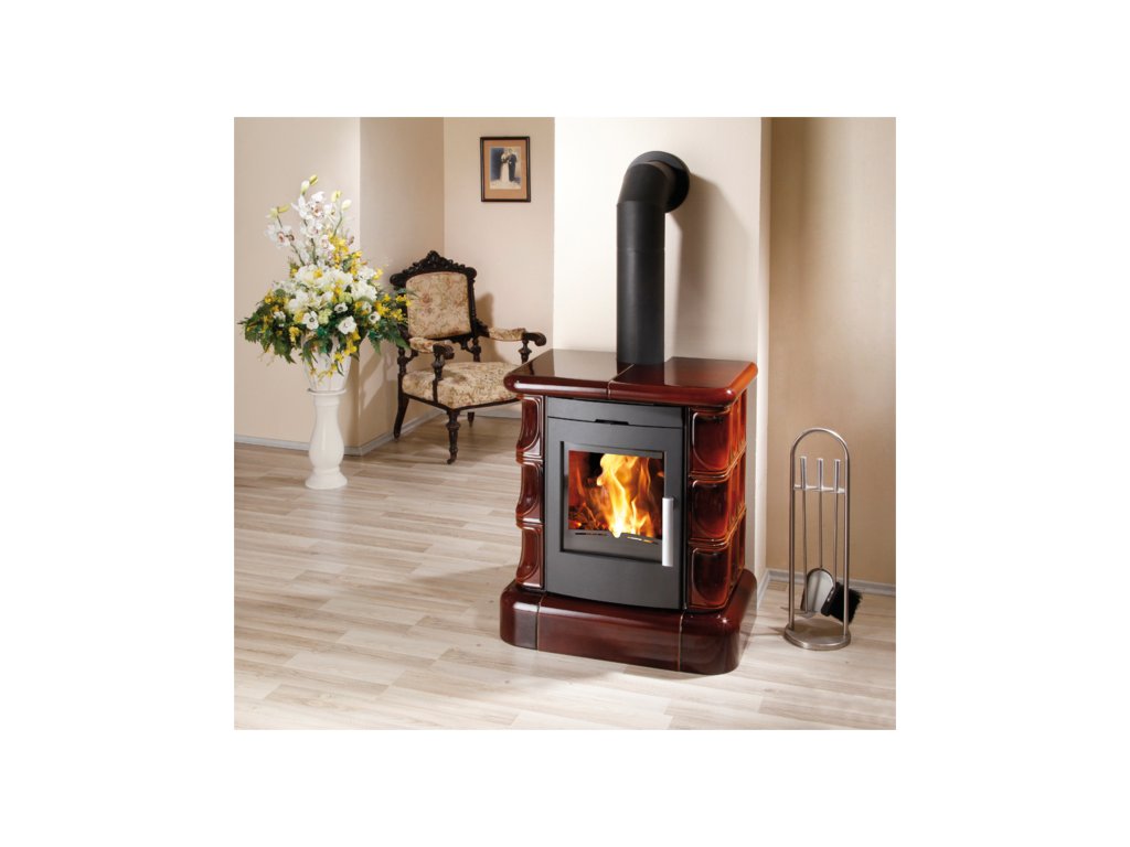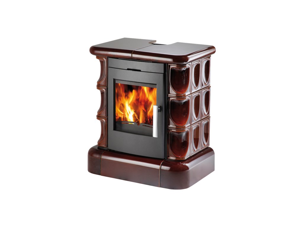 Krbové kachle Haas+Sohn MANTA s výkonom až 7 kW s kachličkovým obkladom a vekom v hnedej farbe.