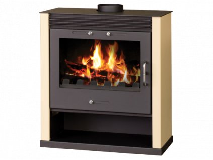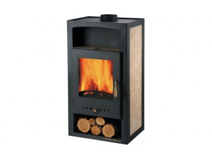 Kachle s výmenníkom Haas+Sohn ADRIA II s výkonom až 10,5 kW (5 kW do vody/5 kW do vzduchu) v čiernej farbe s béžovým obkladom.