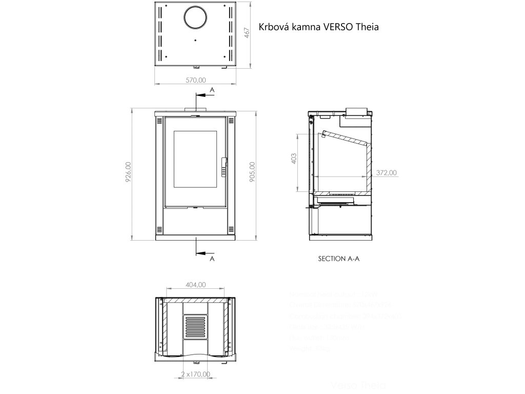Priemer dymovodu je 150 cm. Vývod dymovodu je horný a na výstupe z kachlí je pridaná dymová klapka na reguláciu spalín. Vnútro ohniska je vyložené vermikulitom (univerzálny nerast používaný ako vysokoteplotná izolácia) a vybavený oceľovým roštom. Vykurovací výkon je možné regulovať pomocou klapiek pre primárny a sekundárny vzduch, umiestnených pod dvierkami. Všetky kachle Verso zaisťujú ekologickú udržateľnosť prostredníctvom certifikátov najvyššej energetickej účinnosti A a A+.