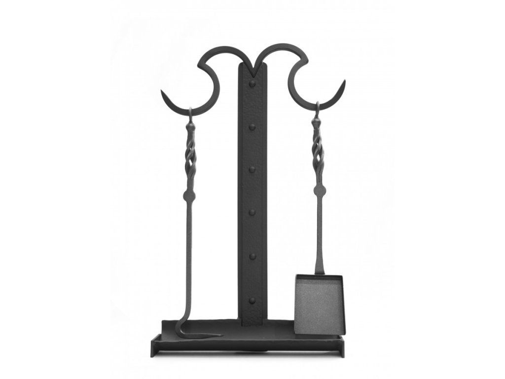 Malý ručne kovaný komplet krbového náradia so stojanom. Klasické vyhotovenie stojana na náradie s dvoma kusmi príslušenstva. Rukoväte z povrazu sa pohodlne držia a neprehrievajú sa.