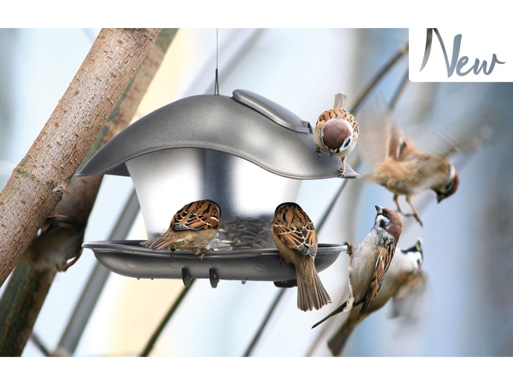 Dvojkomorové záhradné kŕmidlo pre vtáčiky BIRDYFEED SQUARE poskytuje v dlhých zimných mesiacoch miesto, kde sa môžu bezpečne a v pokoji nakŕmiť.
