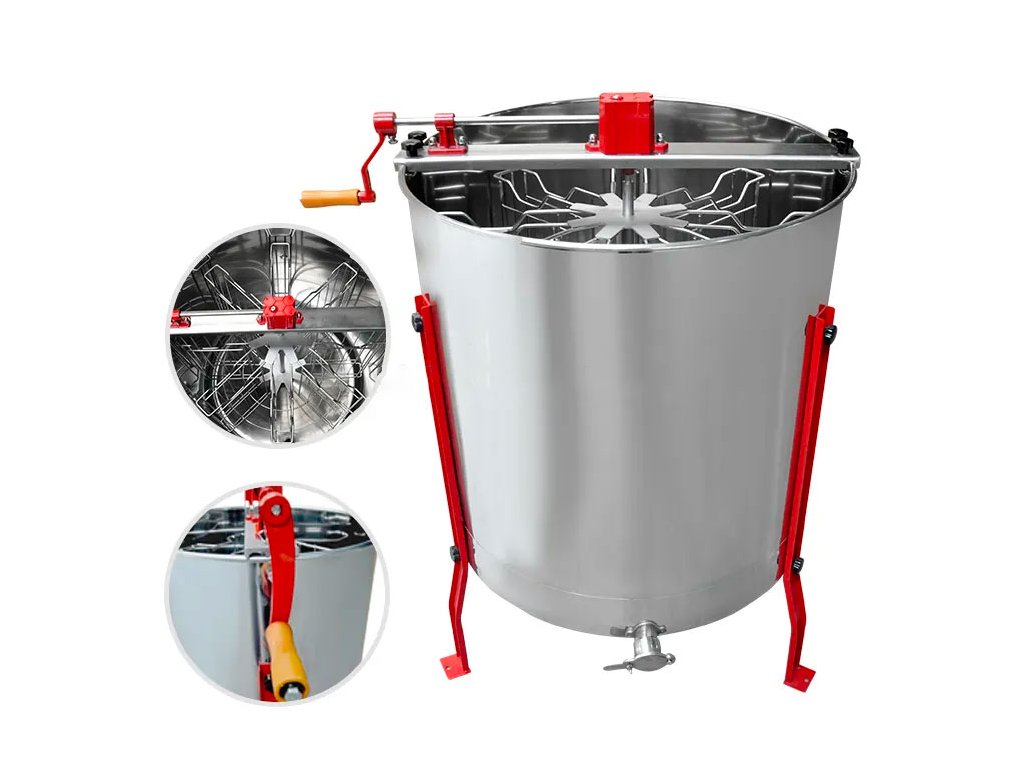 Tento ručný 6-rámikový radiálny medomet je ideálny pre všetkých väčších včelárov. Radiálny medomet vždy umiestňuje plásty lúčovito a je navrhnutý na spracovanie väčšieho počtu rámikov, zvyčajne 6 a viac. Konštrukcia medometu je pevná a veľmi robustná, stojí na troch stabilných nohách. Všetky časti, ktoré prichádzajú do styku s medom, sú vyrobené z nerezovej ocele a sú certifikované na použitie v potravinárstve. Kôš medometu má rozmery 42 cm x 26 cm.Tyčka spája ručnú kľučku s rotujúcim košom. Medomet je dodávaný s kovovým kohútikom, čo zabezpečuje ľahké odčerpávanie medu. Otočný kôš umožňuje vložiť 8 rámčekov. Je možné vložiť nielen rámy pre rozmer Zander, ale aj rámy pre normy DIN. Kryt zariadenia je vyrobený z priehľadného plastu a má 2 odnímateľné časti. Kontrola procesu extrakcie je možná kedykoľvek. Samozrejme je možné všetky časti medometu ľahko vyčistiť.