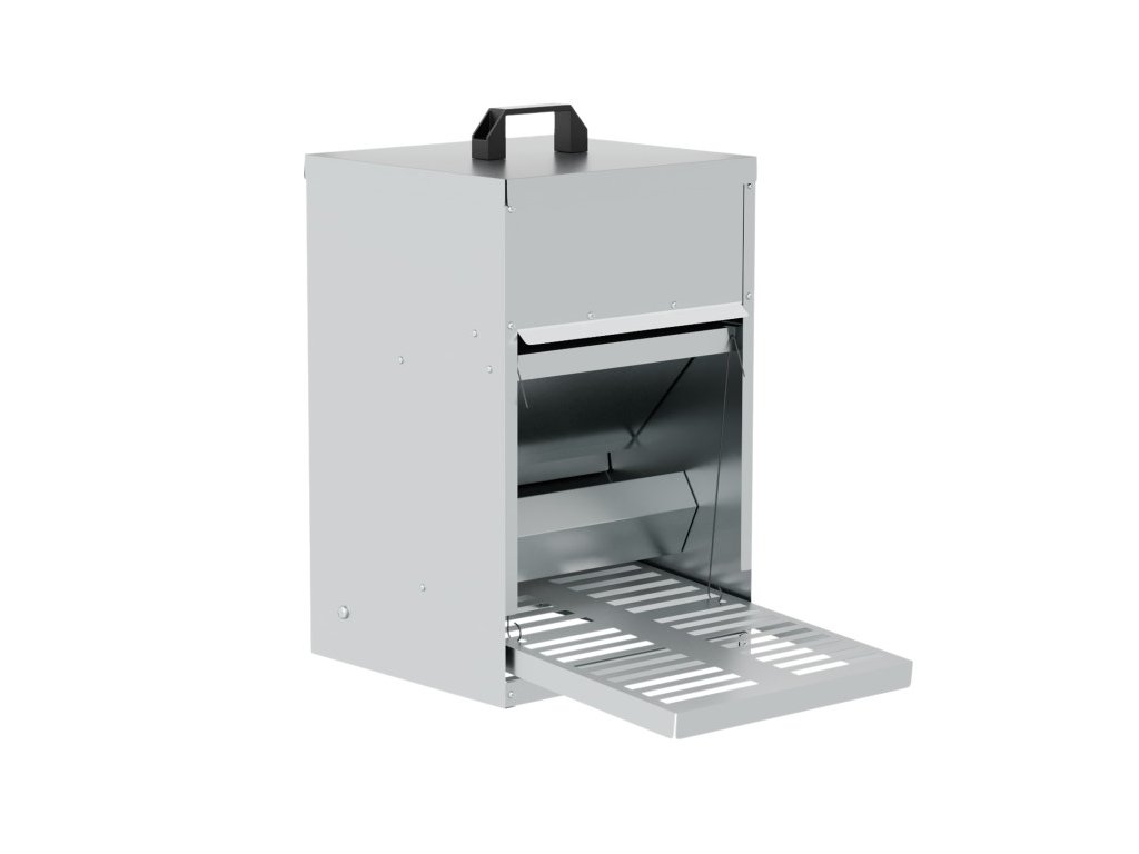 S objemom 16 litrov (približne 10 kg krmiva) poskytne dostatok potravy pre 19–25 sliepok. Kŕmidlo je vybavené dvierkami, ktoré sa automaticky otvoria, keď sliepka na kŕmidlo stúpi. Tým je krmivo dostupné len vašim sliepkam a zostáva chránené pred vonkajšími vplyvmi.