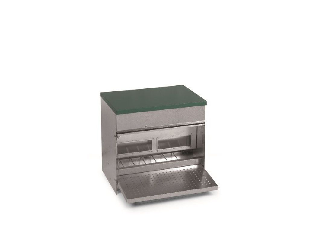 Zásobník je vybavený mechanicky ovládanými dvierkami, ktoré sa aktivujú krokom sliepky, čím sa zabráni prístupu hlodavcov ku krmivu. Kŕmidlo umožňuje nastaviť silu potrebnú na otvorenie dvierok, čo umožňuje prispôsobenie rôznym druhom hydiny. Vďaka praktickému plexisklu na boku kŕmidla máte prehľad o množstve krmiva v zásobníku.